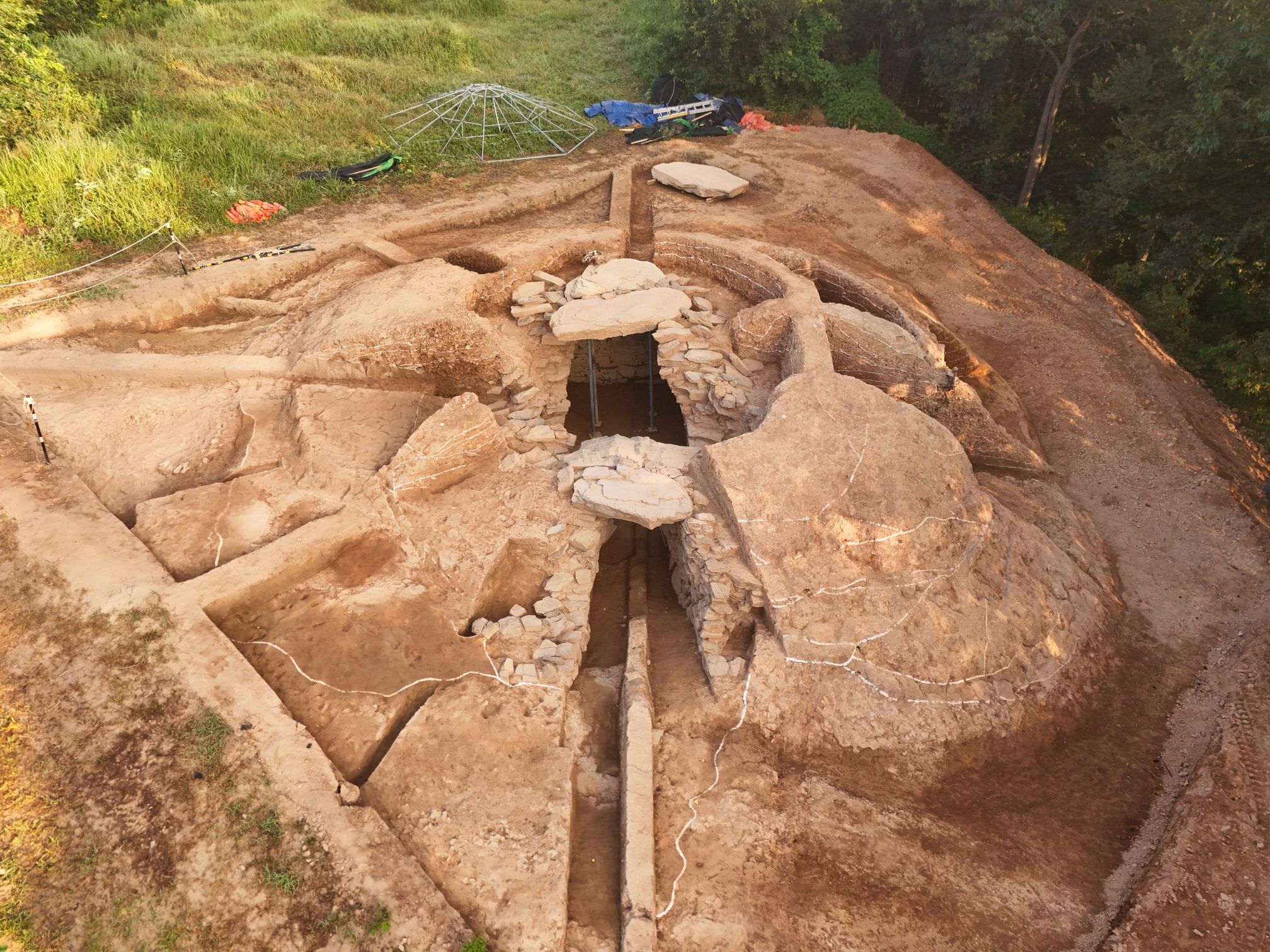 이번 발굴조사에서 진주 동부지역에서 최대 규모로 확인되는 가야 봉토분이 드러났다. 해당 고분은 직경이 13.4~15.2m, 높이가 1.2~4.2m에 달하는 대형 석실 봉토분으로, 매장주체부는 중앙연도식 횡혈식 석실 구조를 갖추고 있었다.