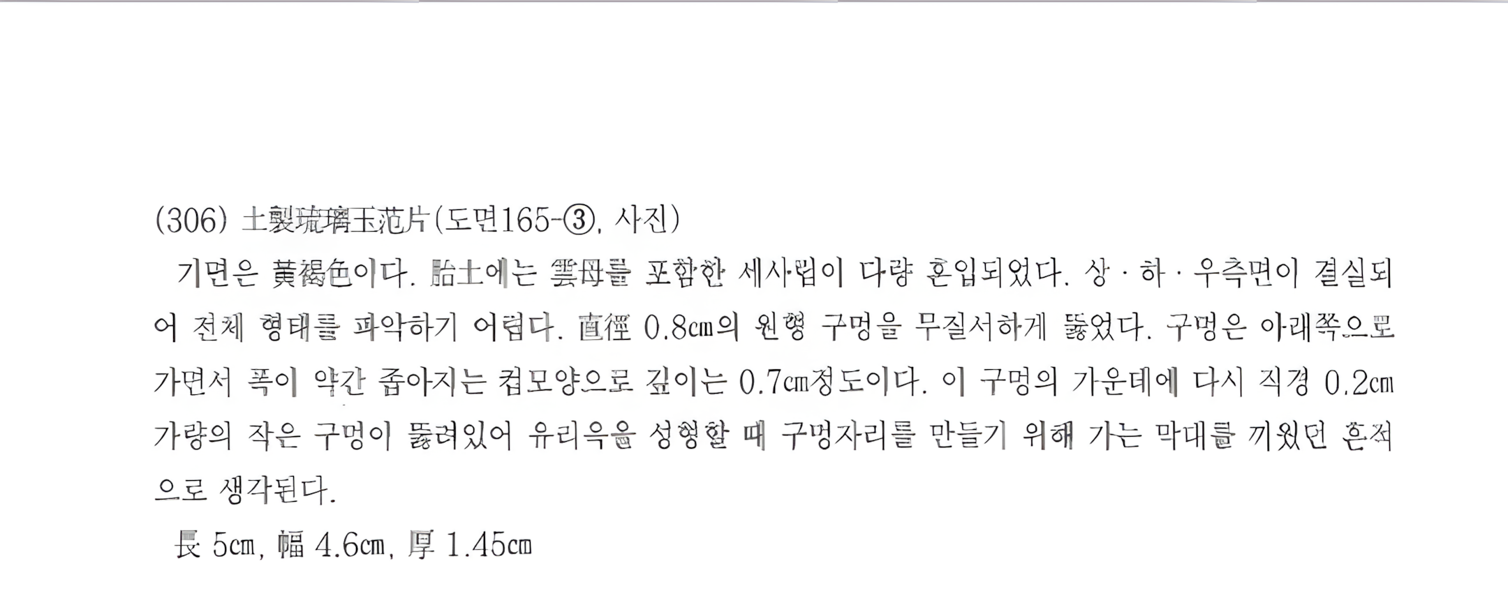 이 구멍의 가운데에 다시 직경 0.2cm가량의 작은 구멍이 뚫려 있어 유리옥을 성형할 때 구멍자리를 만들기 위해 가는 막대를 끼웠던 흔적으로 생각된다. 長 5cm, 폭 4.6cm, 厚 1.45cm.