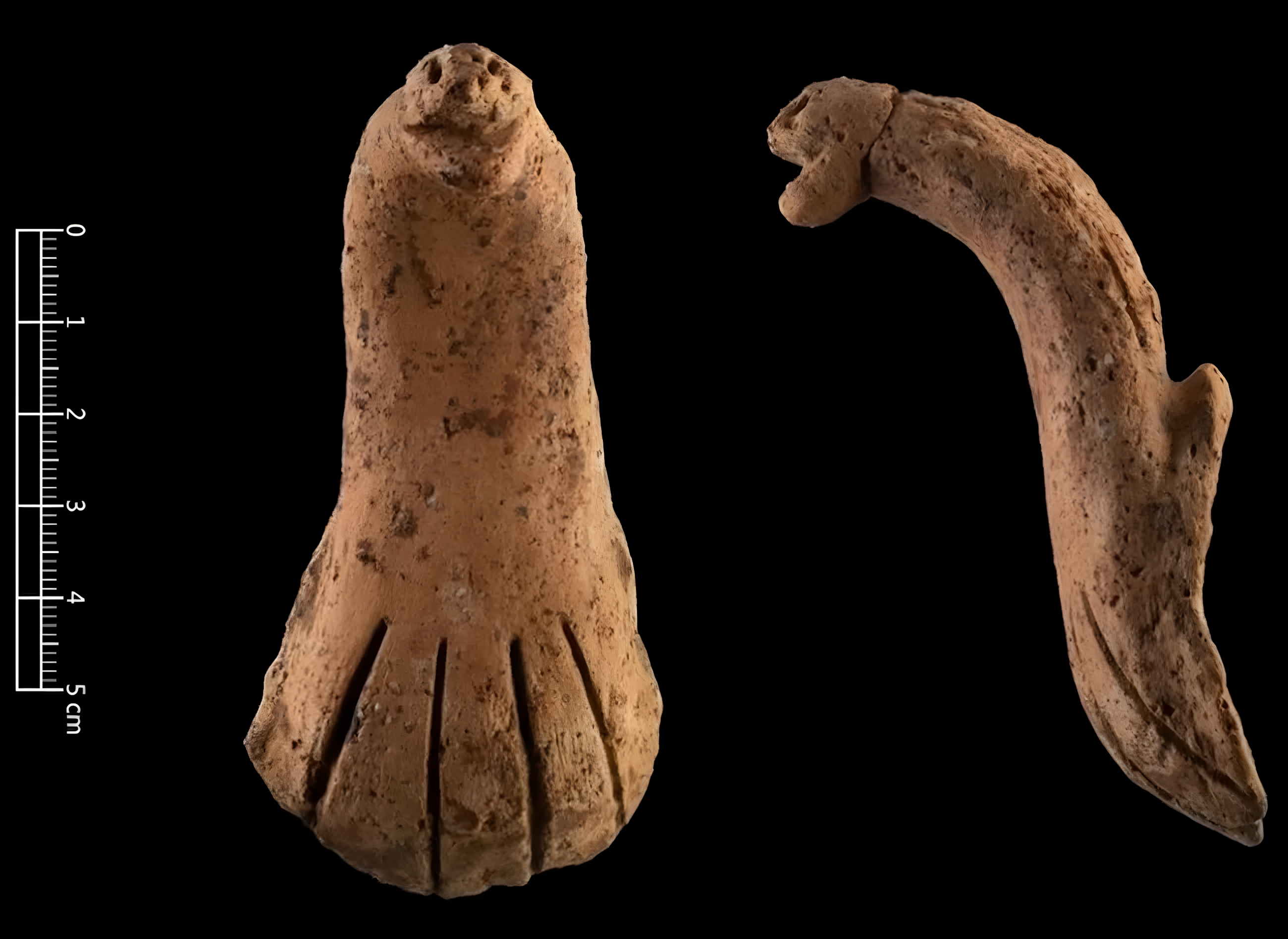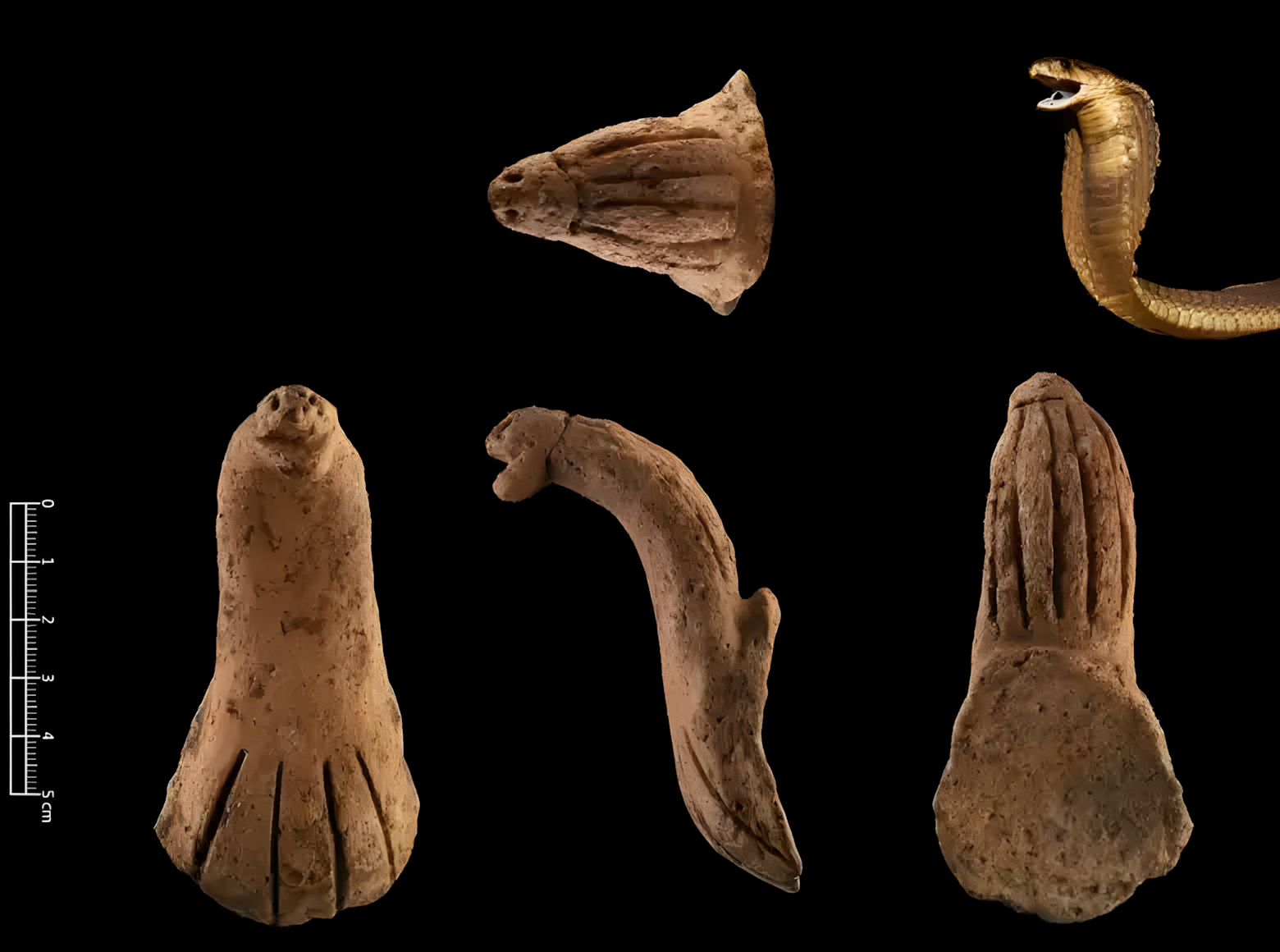 “이 4천 년 된 ‘뱀 모양 토기 손잡이’는 마치 코브라처럼 머리를 치켜들고 머리와 목의 피부 주름이 불룩하게 솟아오른 생생한 형상을 하고 있다. 이 불완전한 유물은 의례용으로 사용된 도기였을 것으로 추정된다”고 추 교수는 말했다.