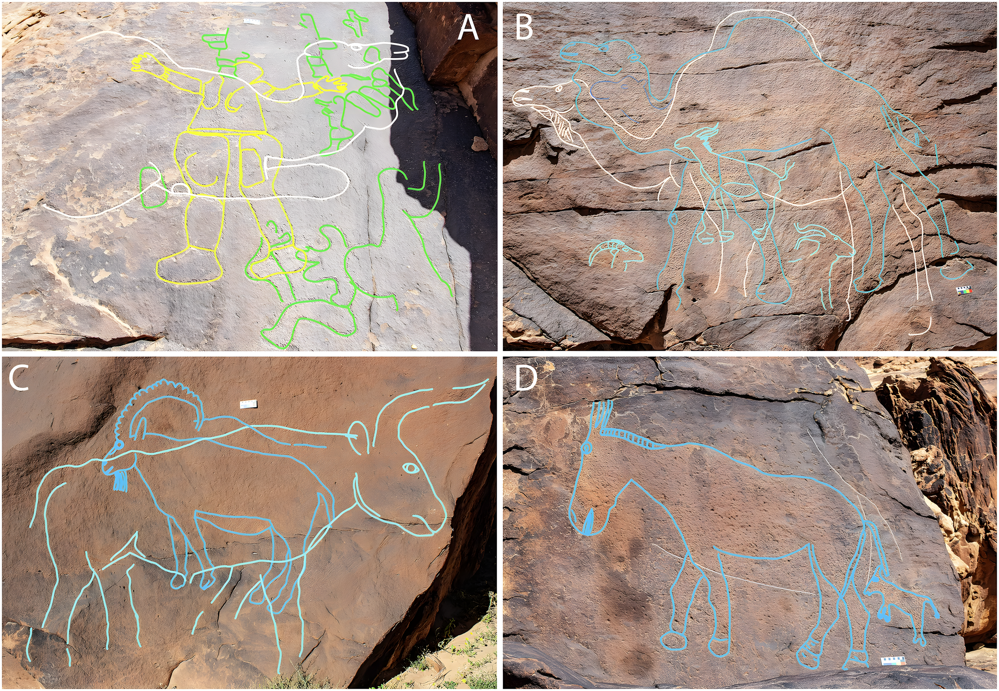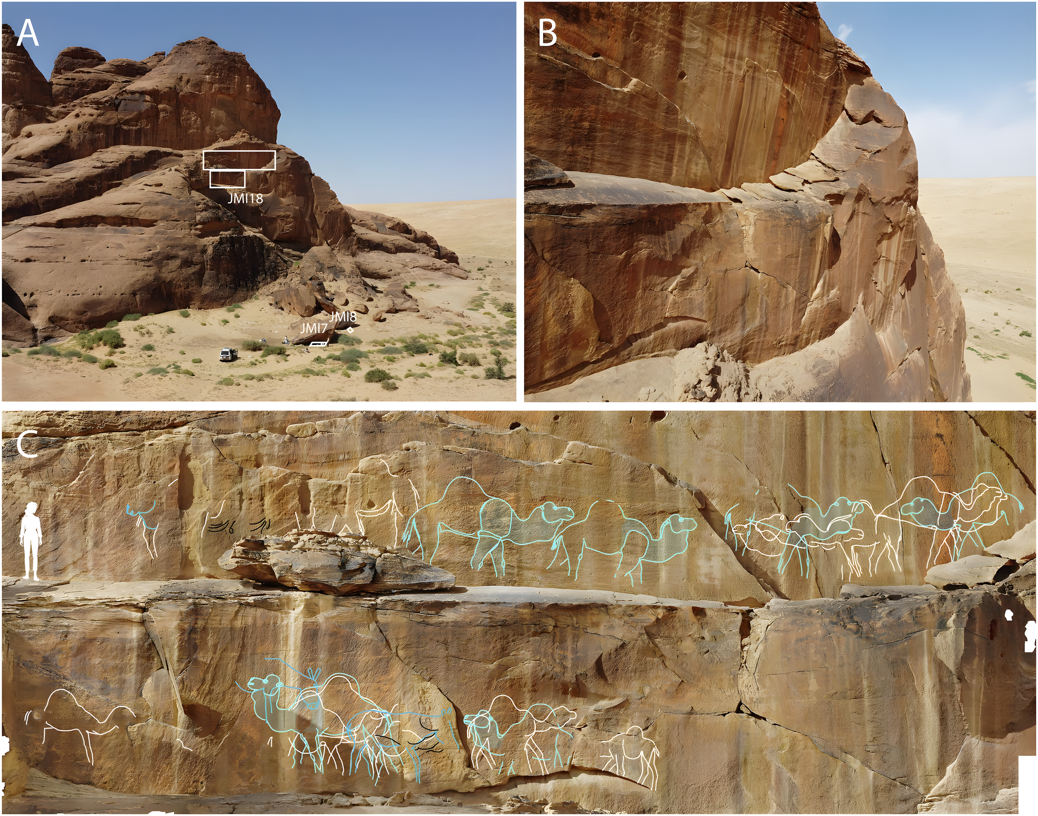 연구팀은 이후 세 곳에서 176개 조각을 새긴 암벽화 패널 62개를 발견했는데, 그중 일부는 해발 39미터 높이 거대한 절벽면에 있었다. 조각들은 대부분 실물 크기의 동물, 주로 낙타를 묘사한다.