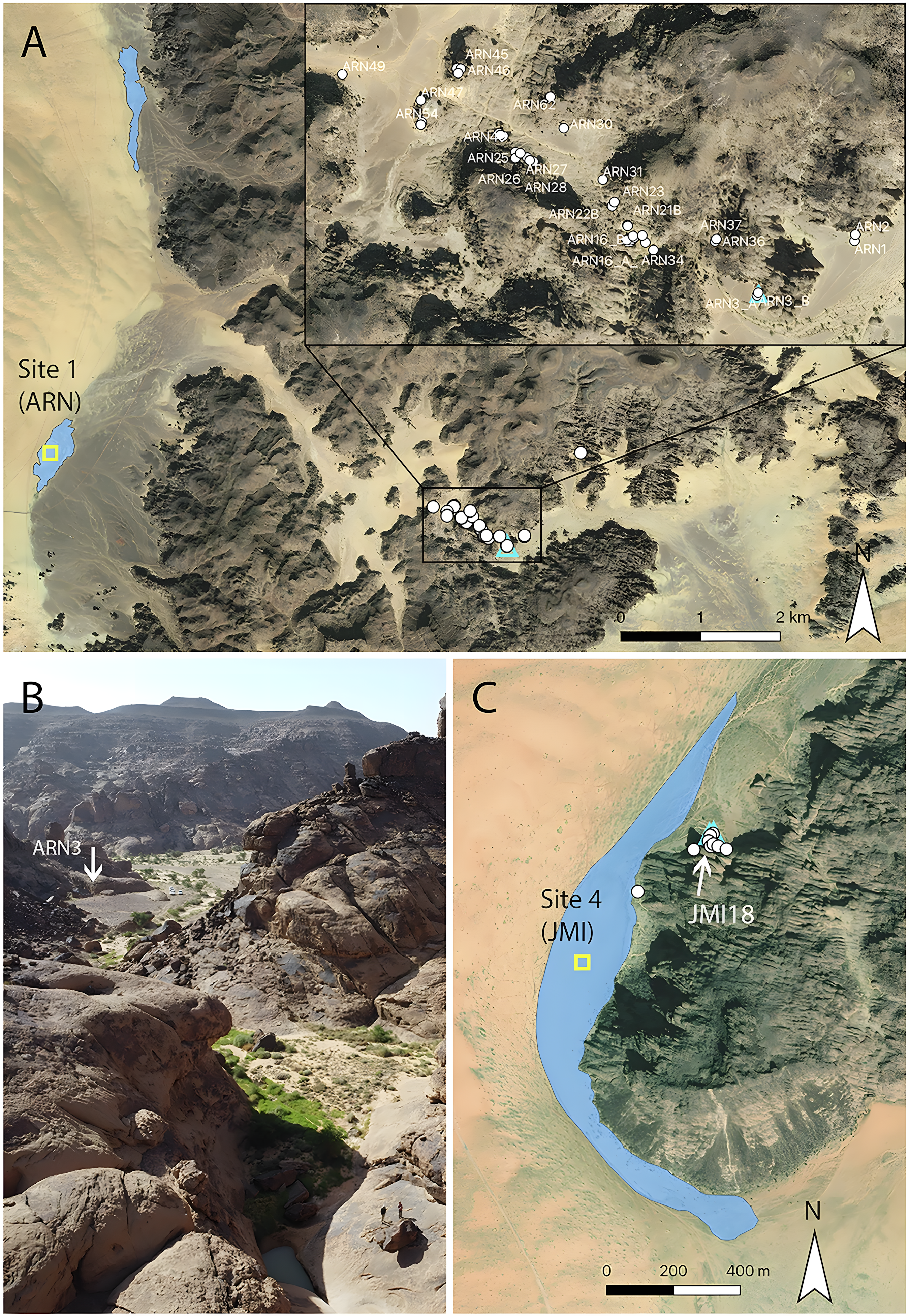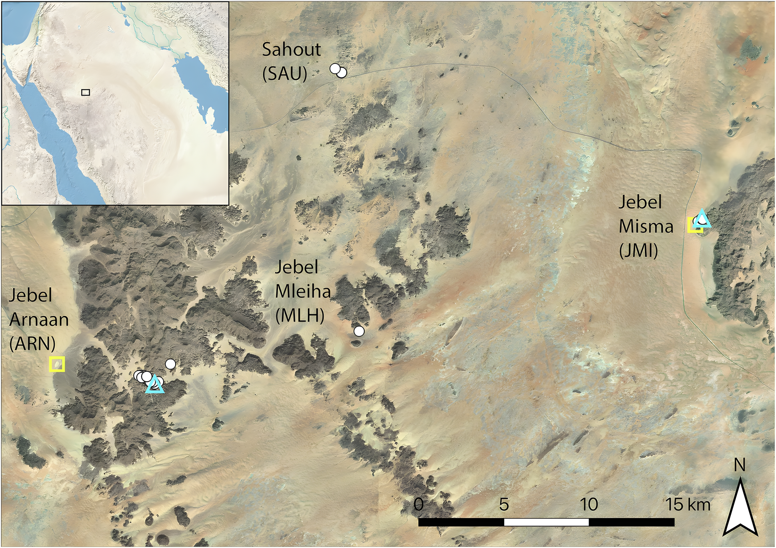 연구팀은 사우디아라비아 북부 네푸드 사막 남쪽 끝에 위치한 제벨 아르난Jebel Arnaan, 제벨 믈레이하Jebel Mleiha, 제벨 미스마Jebel Misma 등 이전에 탐사되지 않은 세 지역에서 176개 조각을 새긴 60개 이상의 암벽화 패널rock art panels을 발견했다.