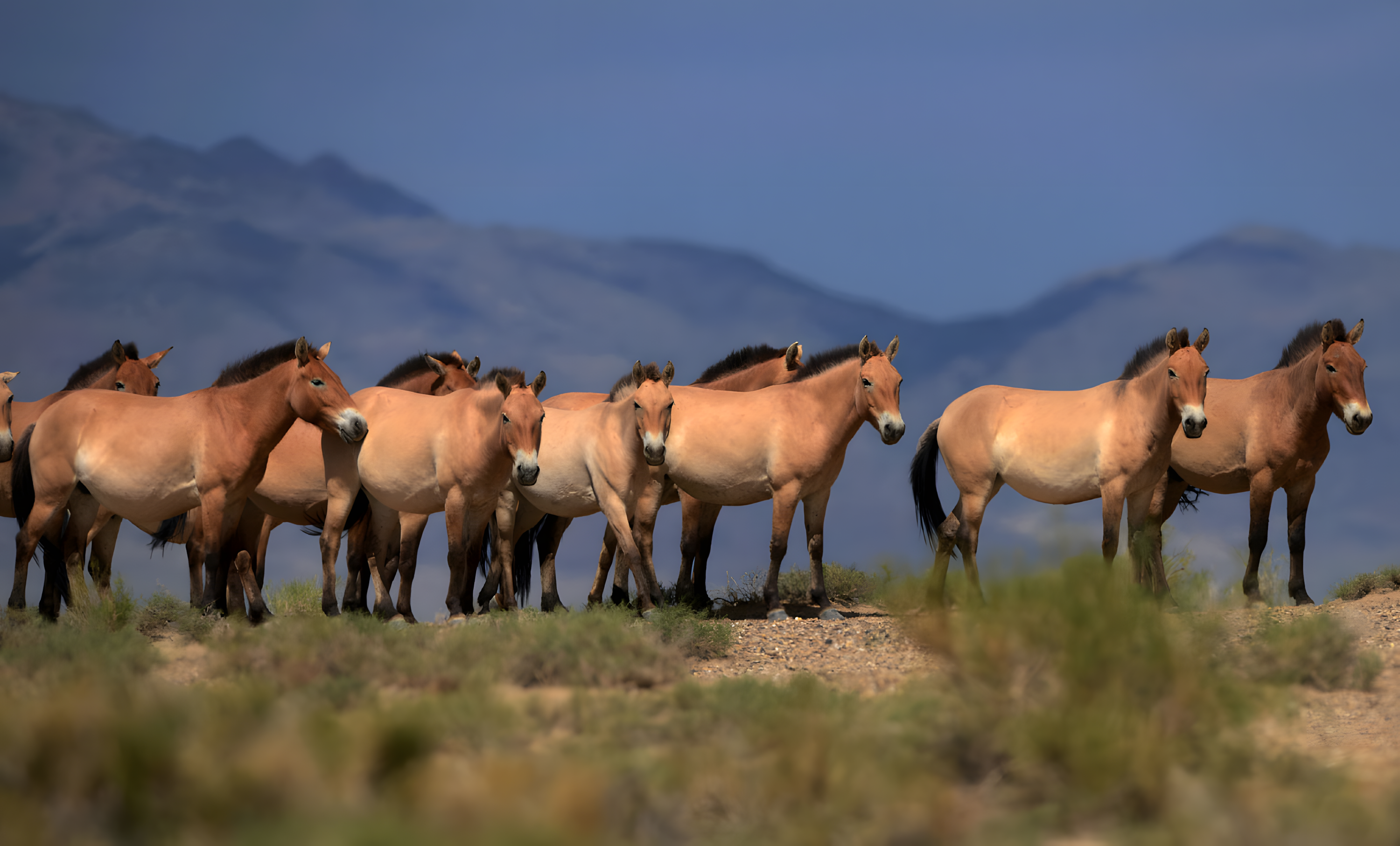 짧고 뻣뻣한 갈기를 지닌 이 땅딸막한 동물은 몽골 대초원에 서식하며, 타키takhi, 즉 "정신spirit"이라고 불리며 국가적 상징으로 여겨진다.