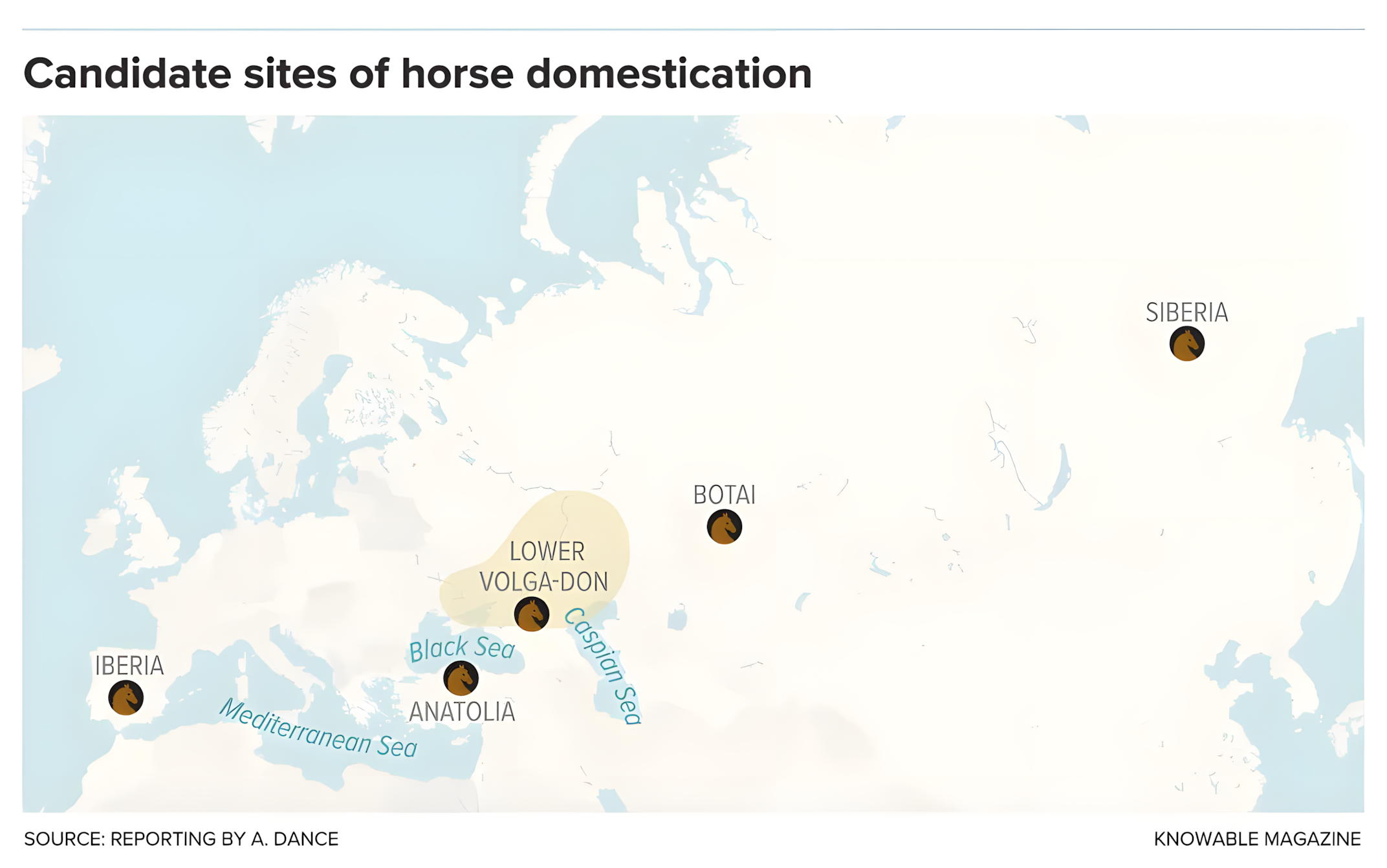 카스피해 주변 동유럽 지역에서 고고학자들은 말 유해가 다른 가축 유해와 함께 발견되는 것을 발견했다.
