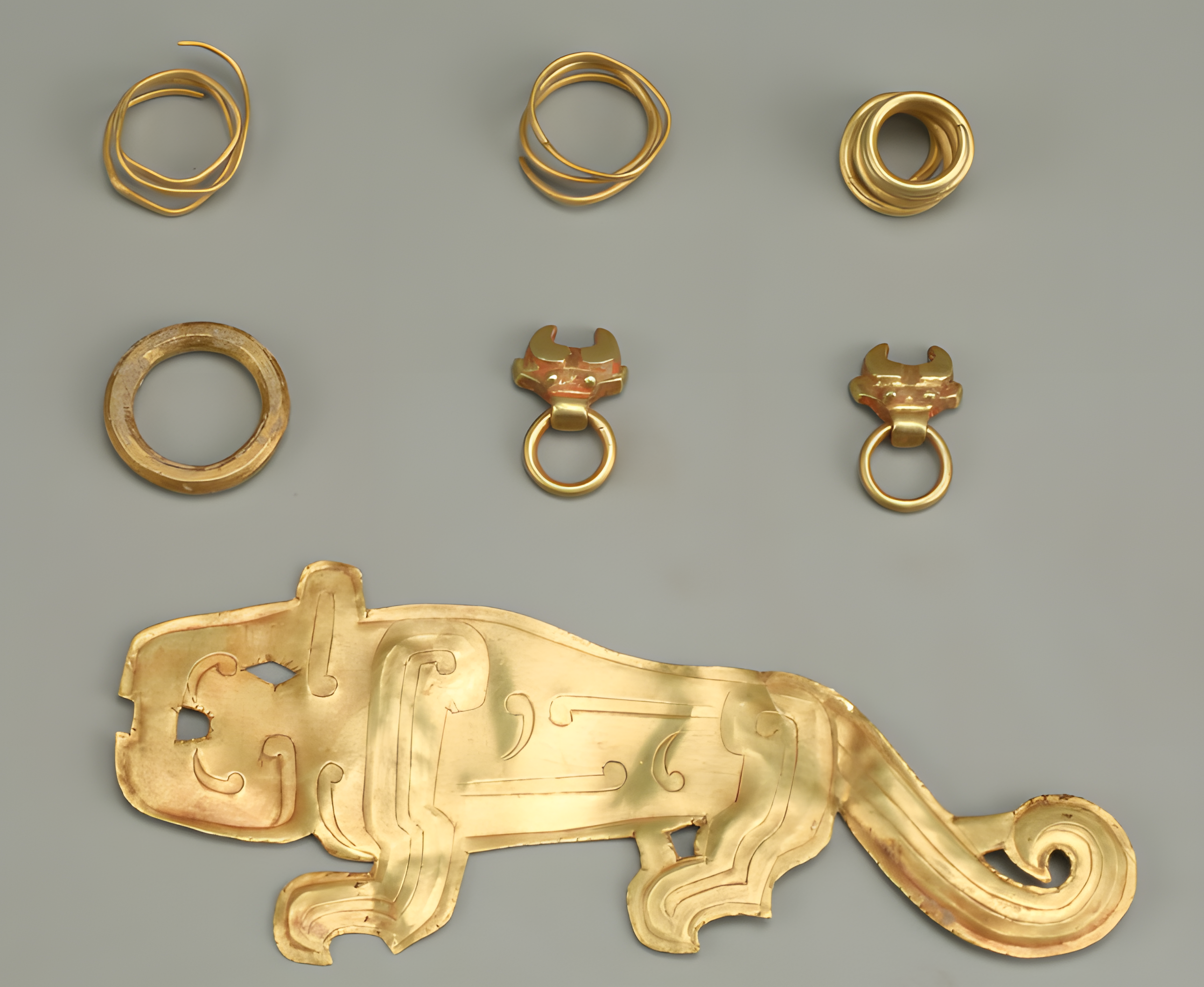 대묘에서 출토된 금수권장金首权杖, 청동복青铜鍑, 철창铁矛 등과 일부 중소형 무덤에서는 나선형 금귀걸이螺旋状金耳环, 금팔찌金手镯 등의 장식품이 나와 북방 초원 문화 향기가 가득하다.