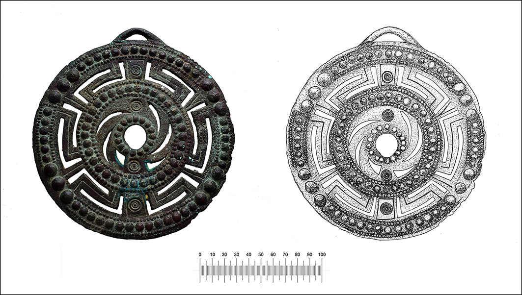 동심원 무늬, 각진 문양, 그리고 정교하게 간격을 둔 구멍들로 장식한 이 원반은 태양 이미지와 의례적 관습과 관련된 정교한 금속 세공 전통을 보여준다.