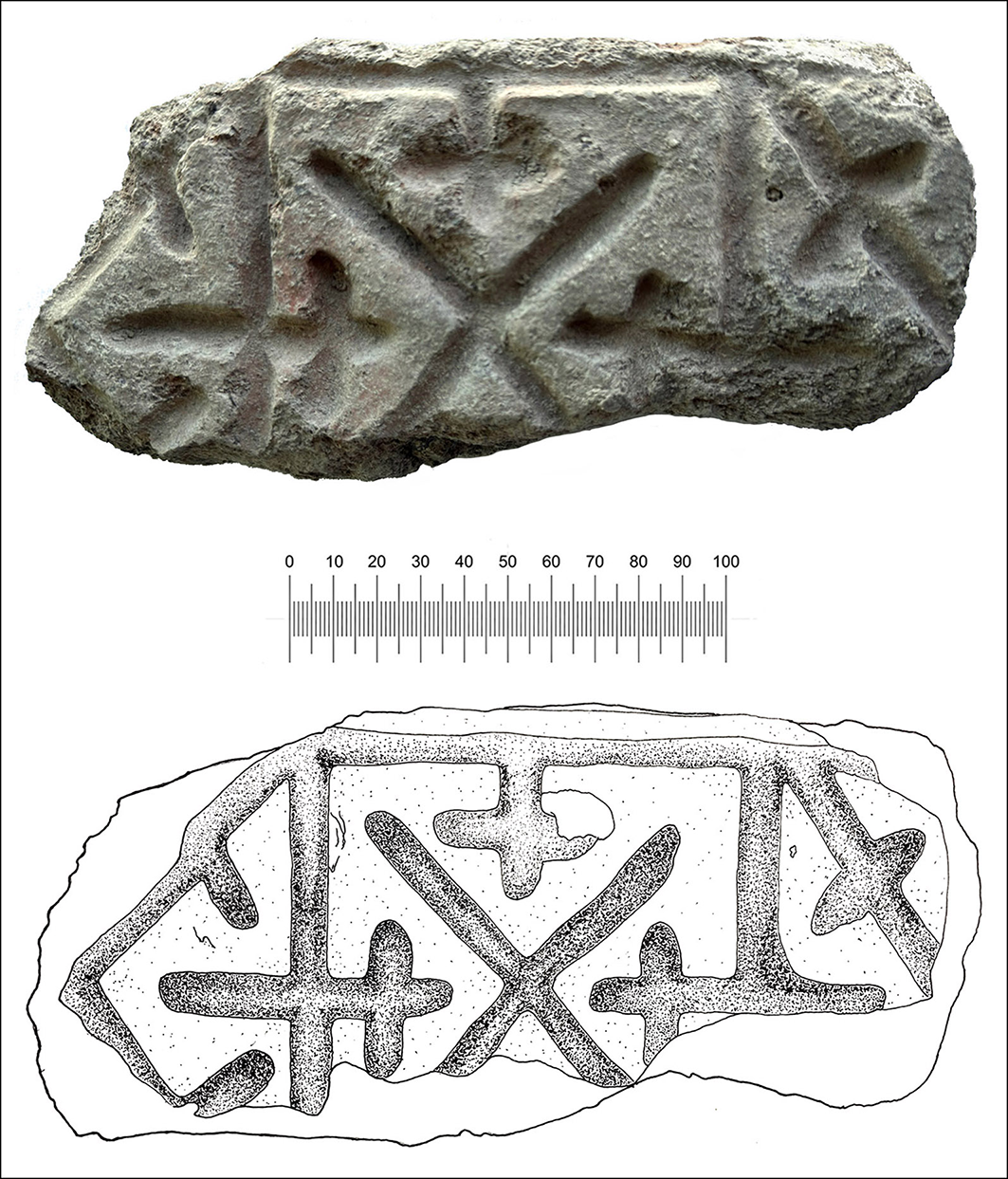 가마나 높은 단상과 같은 점토 구조물에 박혀 있던 이 점토판에는 붉은색, 흰색, 진한 파란색으로 기하학적 무늬가 새겨지고 채색되어 있다.