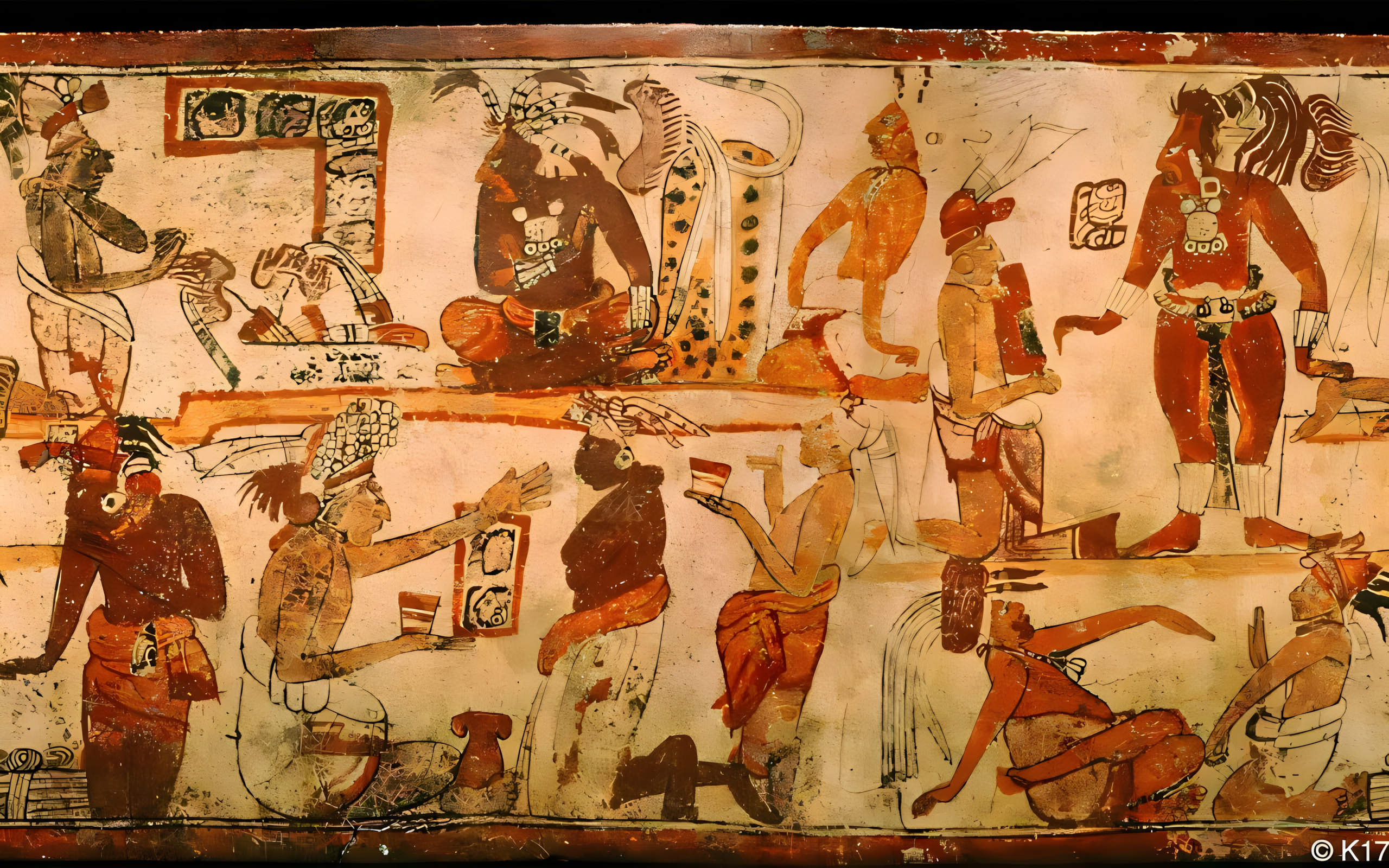마야 세계에서는 고전기 후기Late Classic (서기 600~900년)에 궁정 풍경과 왕실 장례를 그린 뼈 막대기가 등장한다.