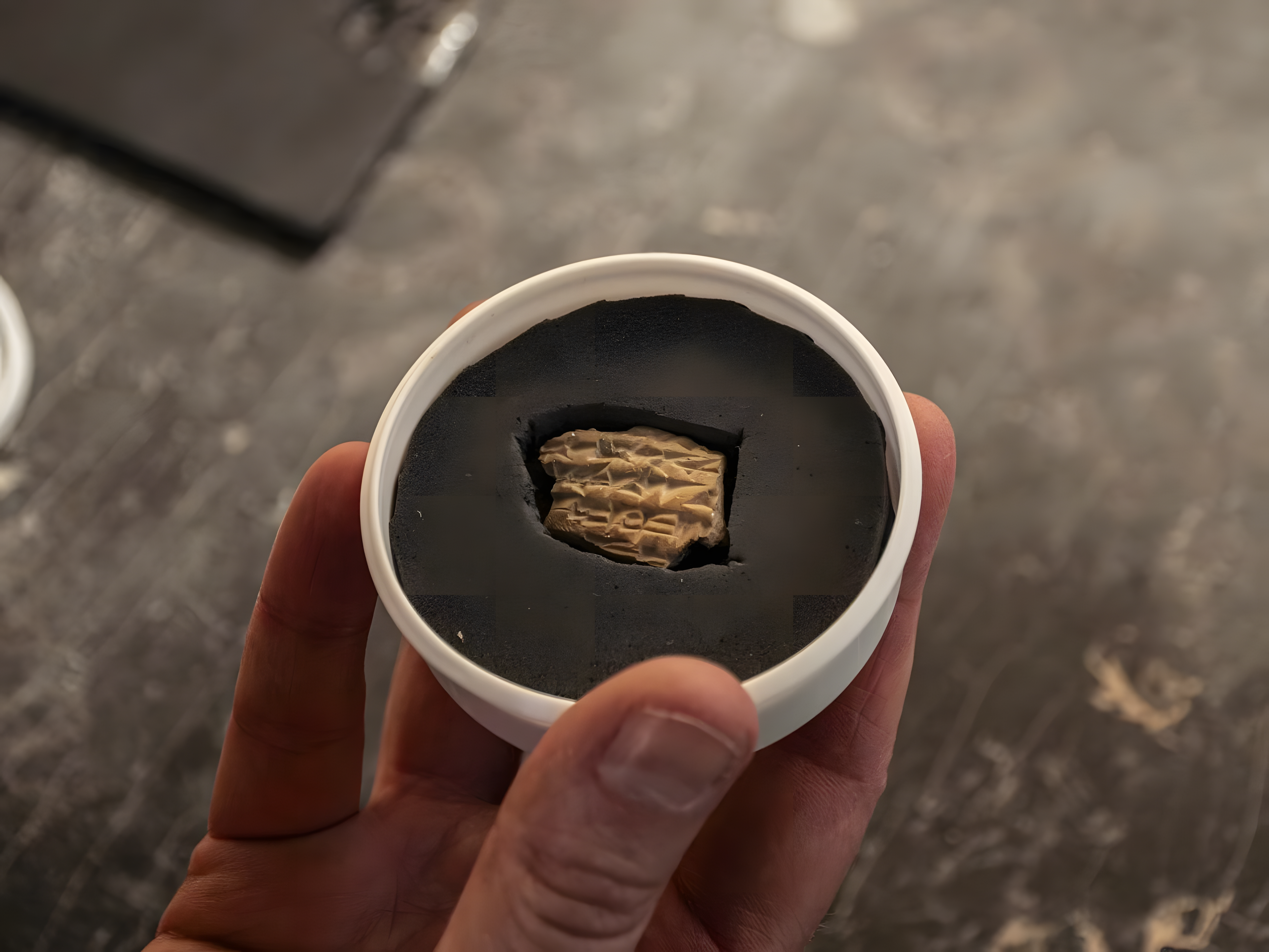 지름 2.5cm에 불과한 이 작은 도기 조각은 아카드 설형 문자Akkadian cuneiform로 새겨졌으며, 이스라엘 고대 유물 관리국Israel Antiquities Authority (IAA)과 다윗성 재단City of David Foundation이 공동으로 진행한 발굴 작업을 통해 성전산Temple Mount 서쪽 성벽 근처에서 발견되었다.