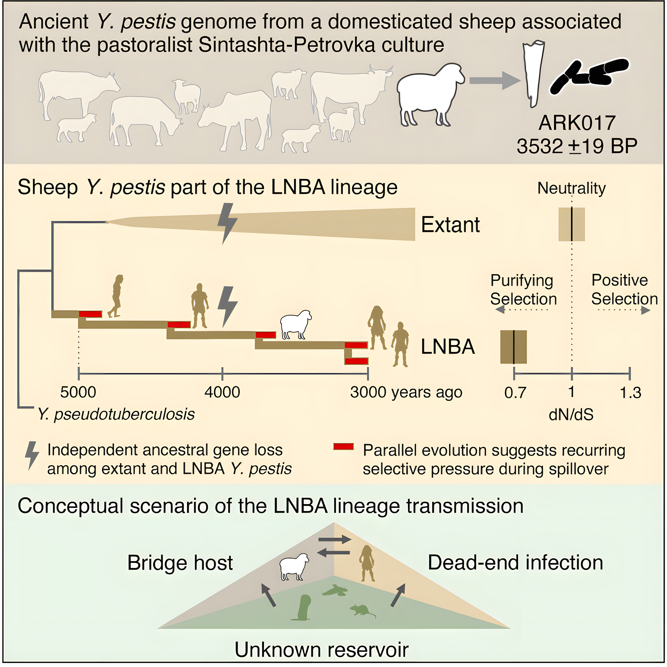 연구팀은 현재 러시아 남부 우랄 산맥, 카자흐스탄 국경 인근에 위치한 요새 유적 아르카임Arkaim에서 출토된 4,000년 된 가축 양에서 페스트균(Y. pestis) DNA를 발견했다.