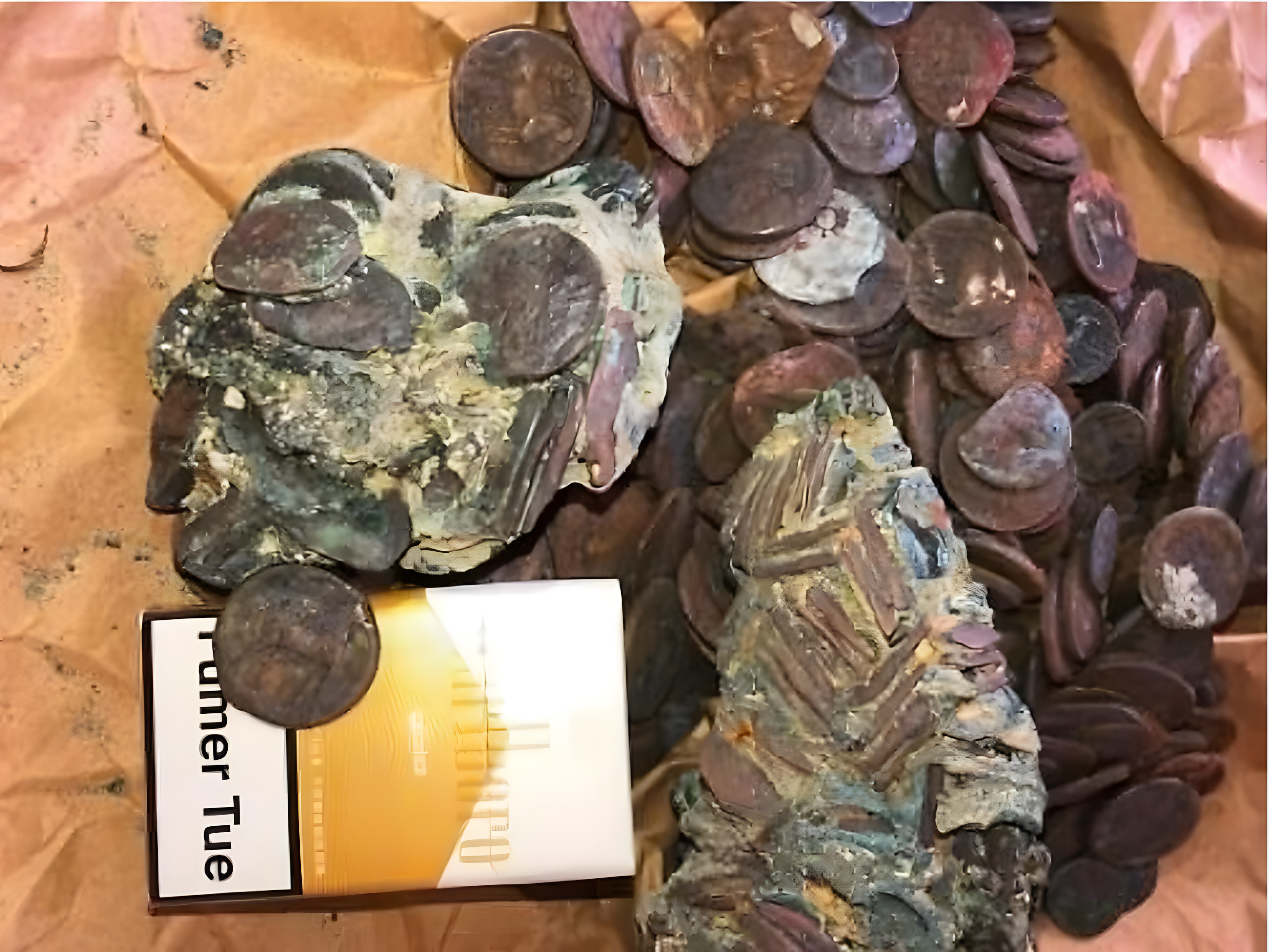 동전들은 모두 물에 잠겨 부식되었으며, 앞면에는 타니트Tanit 여신이, 뒷면에는 야자수 앞에 서 있는 말이 새겨 있다.