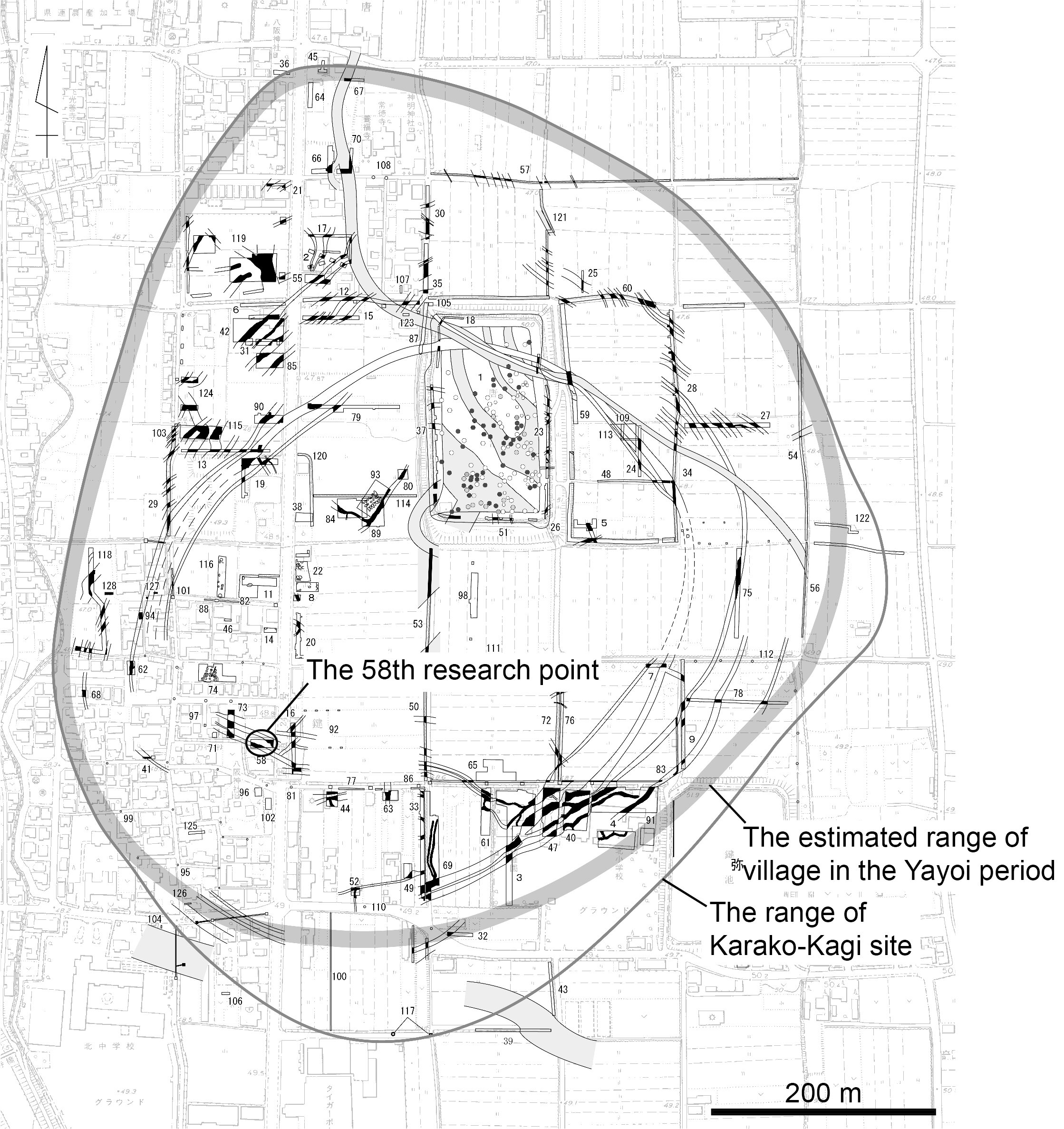 현재 나라현 다와라모토정Tawaramoto Town에 위치한 카라코카기 유적은 야요이 시대에 긴키 지방 중심지 역할을 한 곳으로 여겨진다.