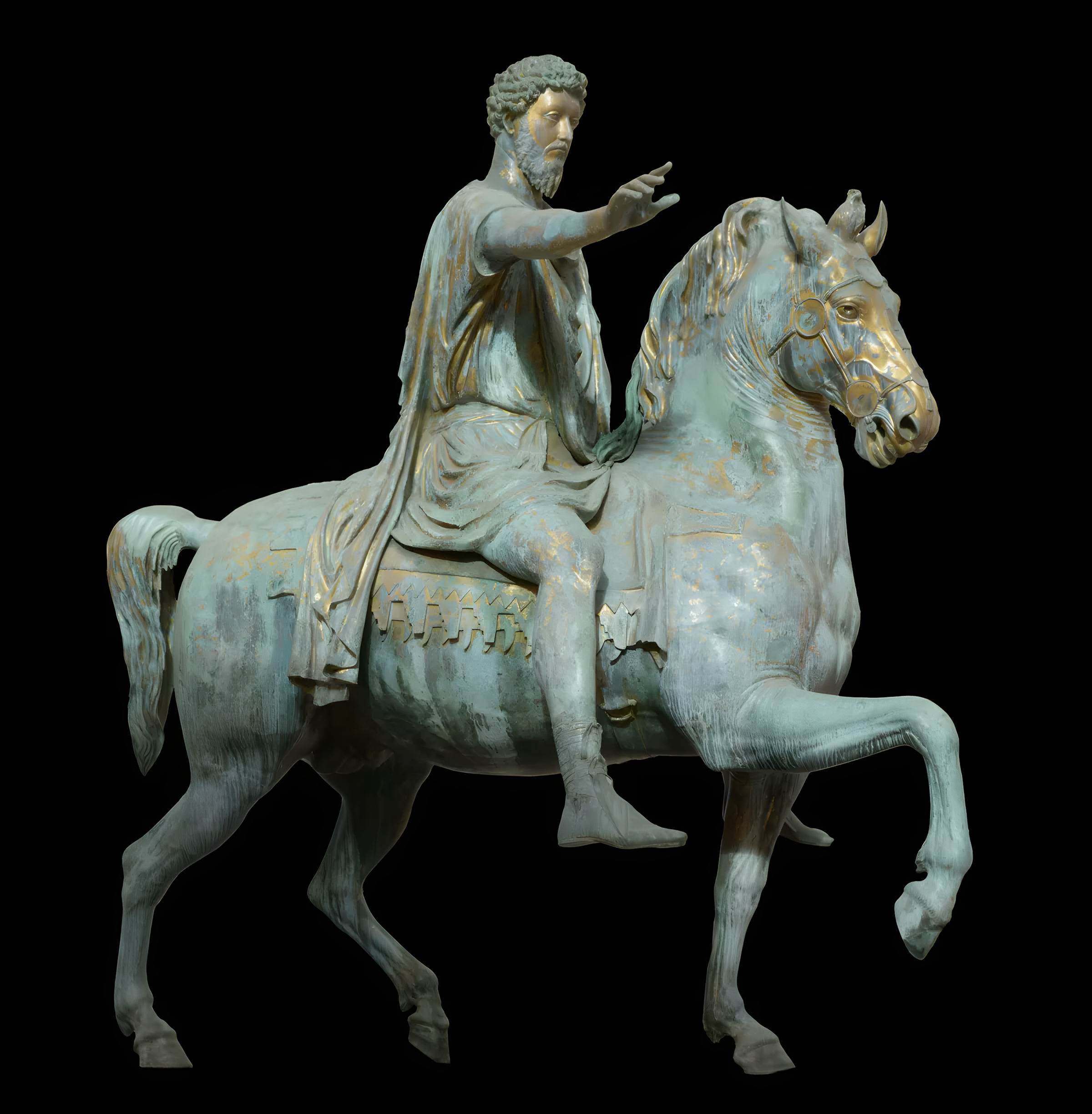 말을 탄 로마 황제 모습을 묘사한 이 거대한 조각상은 그가 군대에 연설하는 모습을 보여준다.