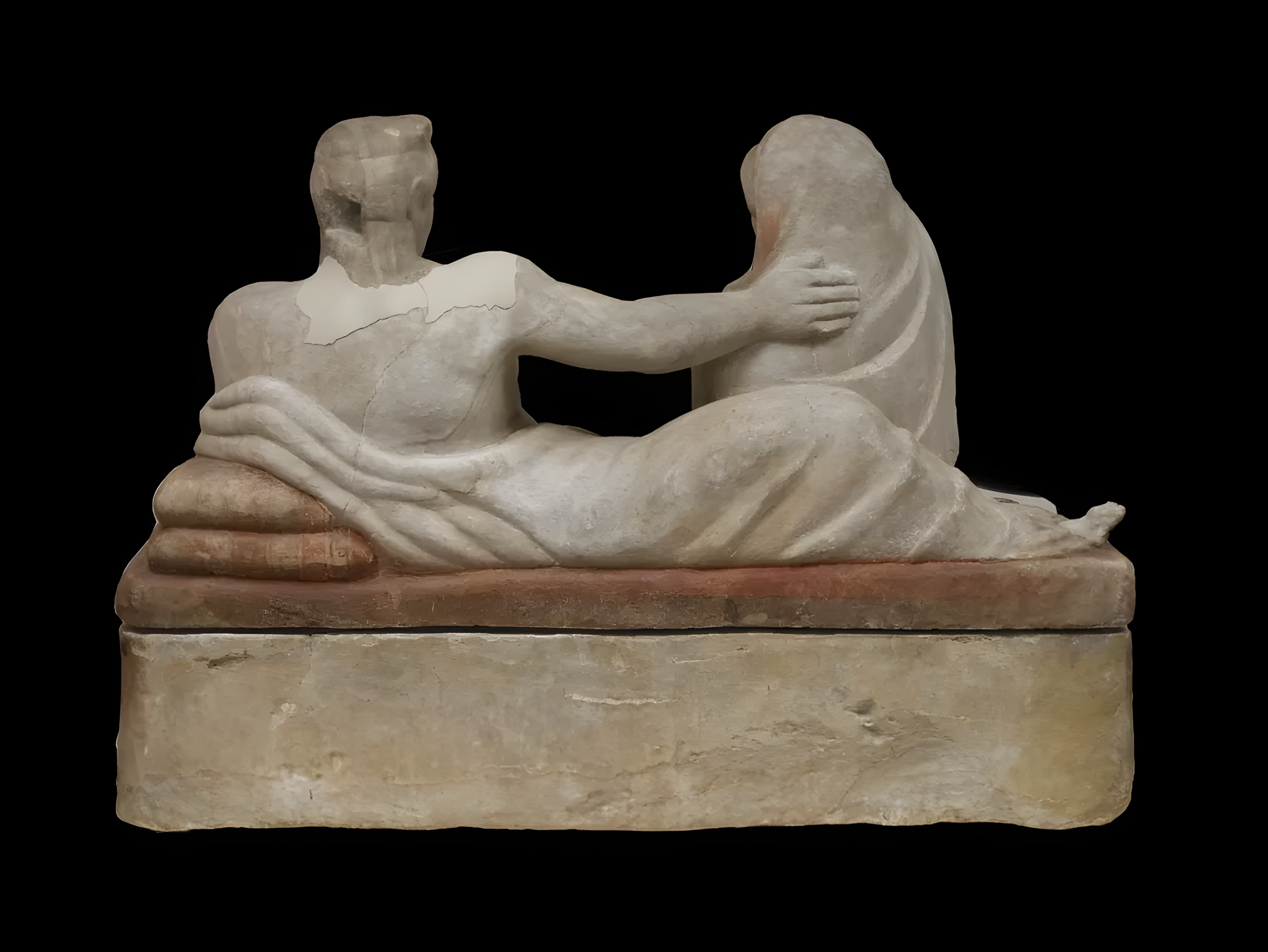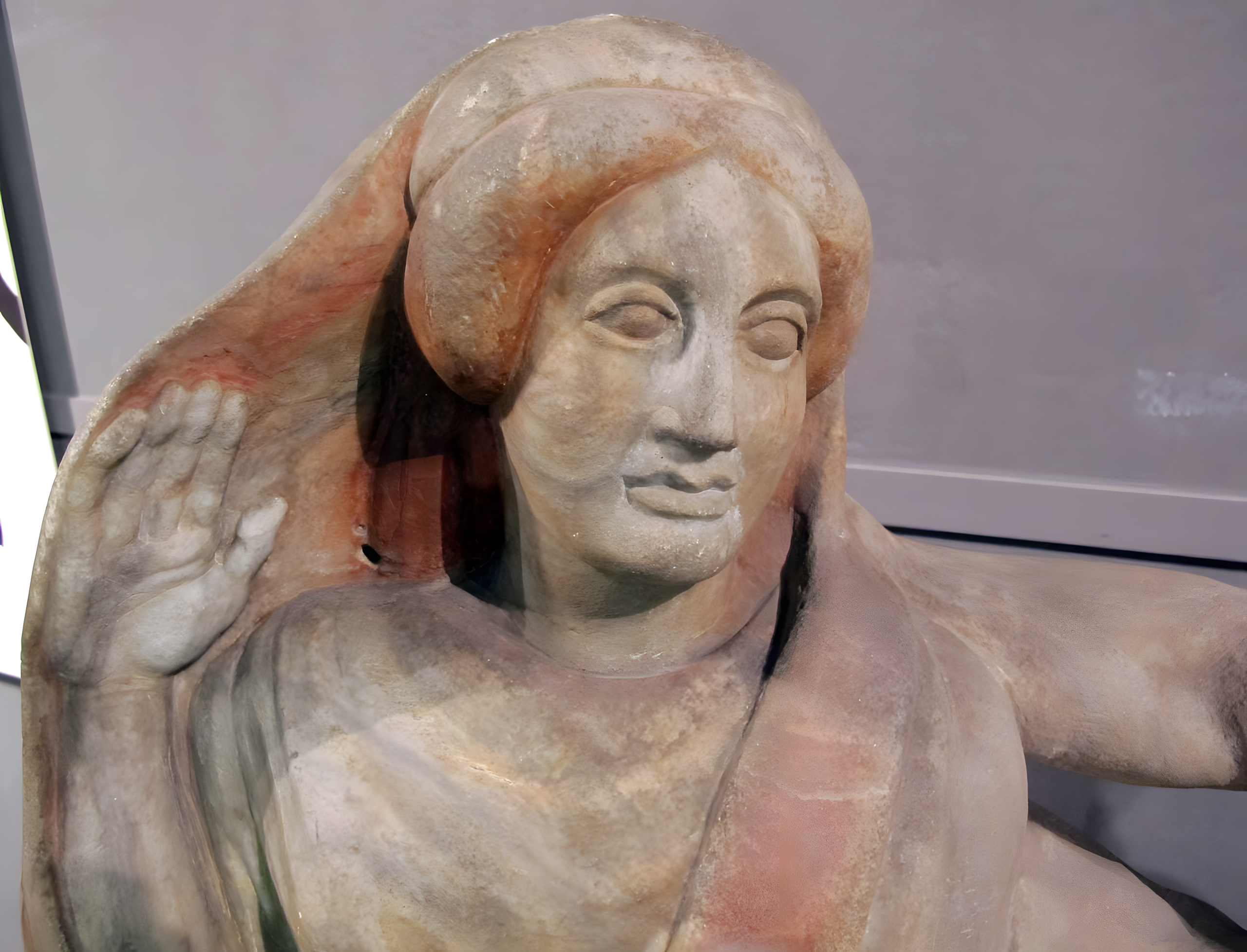 이집트 청색Egyptian blue[이집션 블루], 황토ochre, 주사cinnabar과 같은 안료로 조각한 다채로운 색상polychromy은 후대 사람들이 단색으로만 여긴 에트루리아 조각의 생동감 넘치는 모습을 엿볼 수 있는 귀중한 기회를 제공한다.