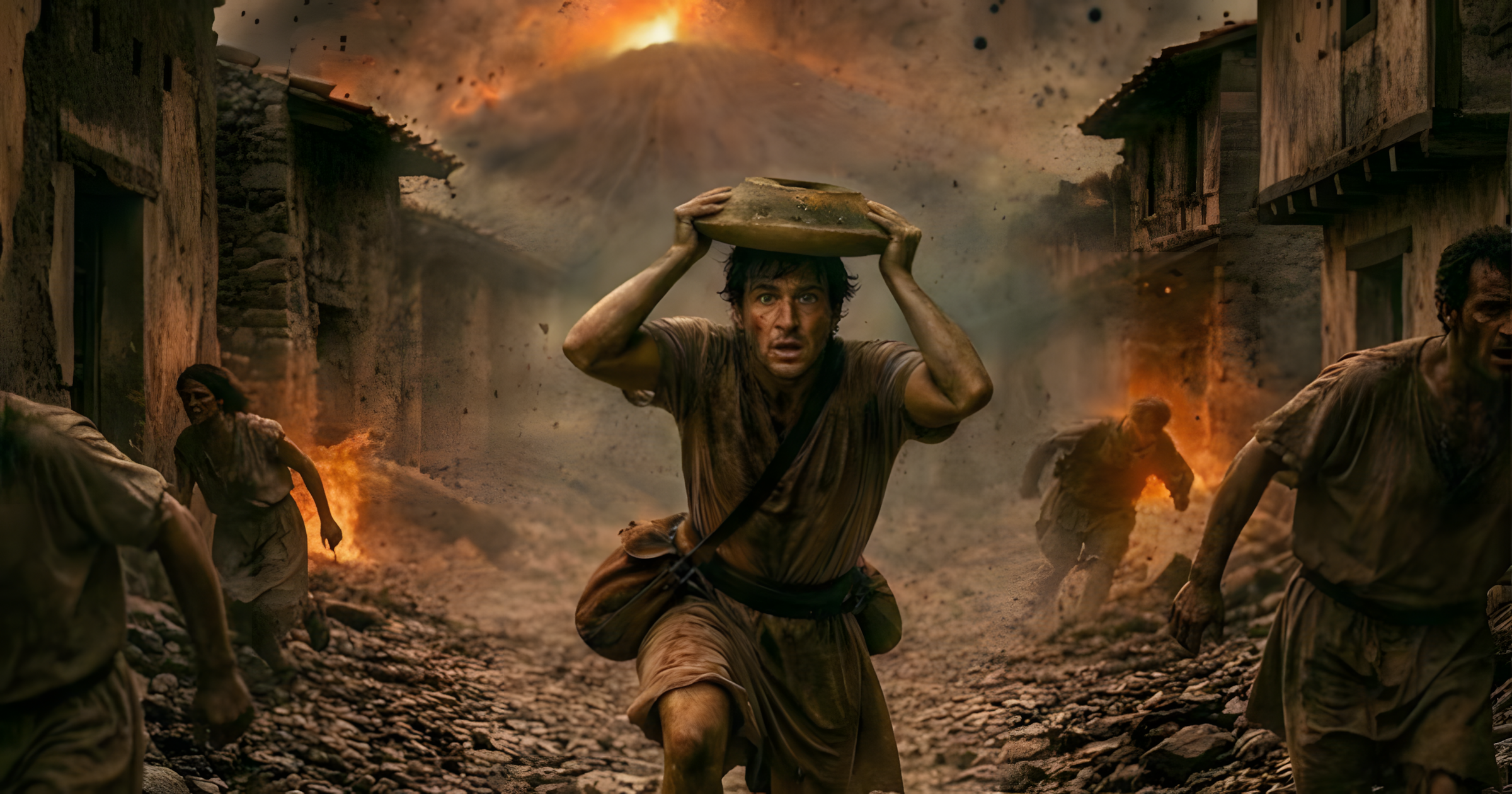 완성된 이미지는 잔해로 뒤덮인 길을 따라 걷는 남자 모습을 보여주며, 배경에서는 베수비오 화산이 격렬하게 폭발하는 가운데 그가 절구통을 머리 위로 들어 올리고 있다.