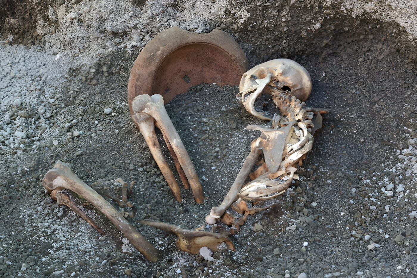 고고학자들은 테라코타 절구terracotta mortar 옆에 누운 이 희생자를 발견했다.