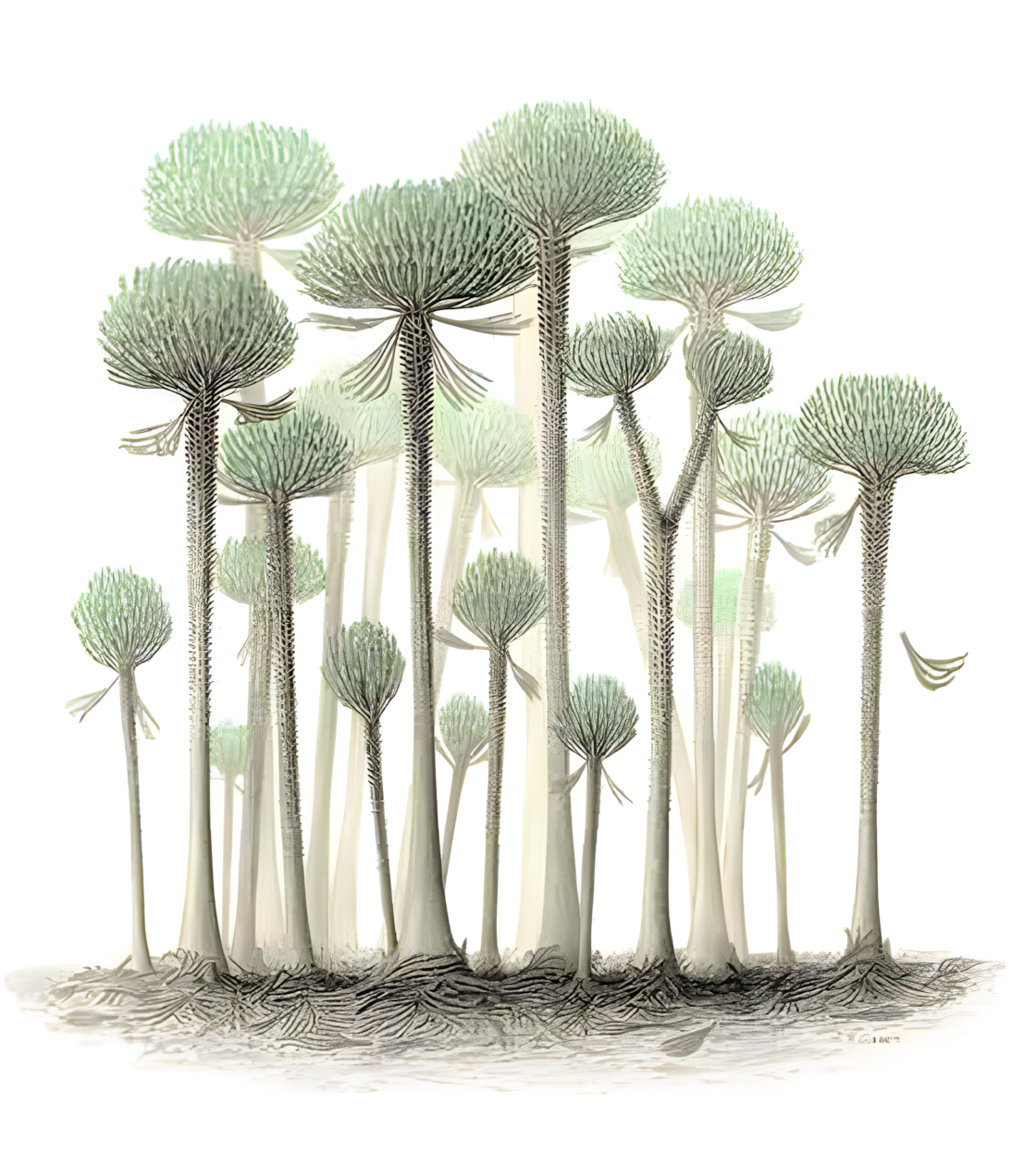칼라모피톤Calamophyton으로 확인된 이 나무들은 야자수와 매우 유사하지만, 줄기가 가늘고 속이 비었다.