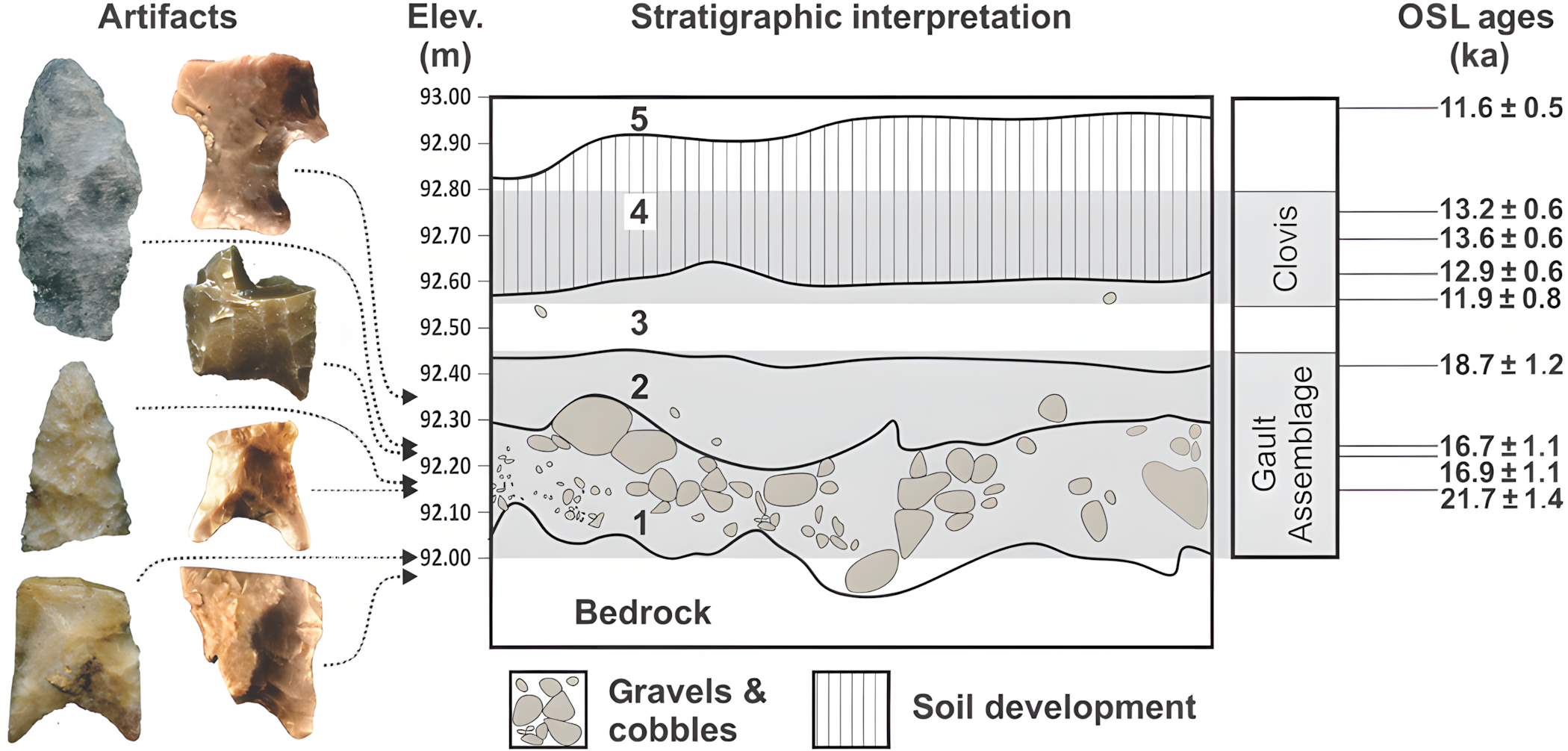 클로비스 유물이 포함된 퇴적층 아래를 발굴한 결과, 클로비스 유물과는 확연히 다른 유물(골트 유물군)이 포함된 층위가 잘 발달된 퇴적층이 드러났다.