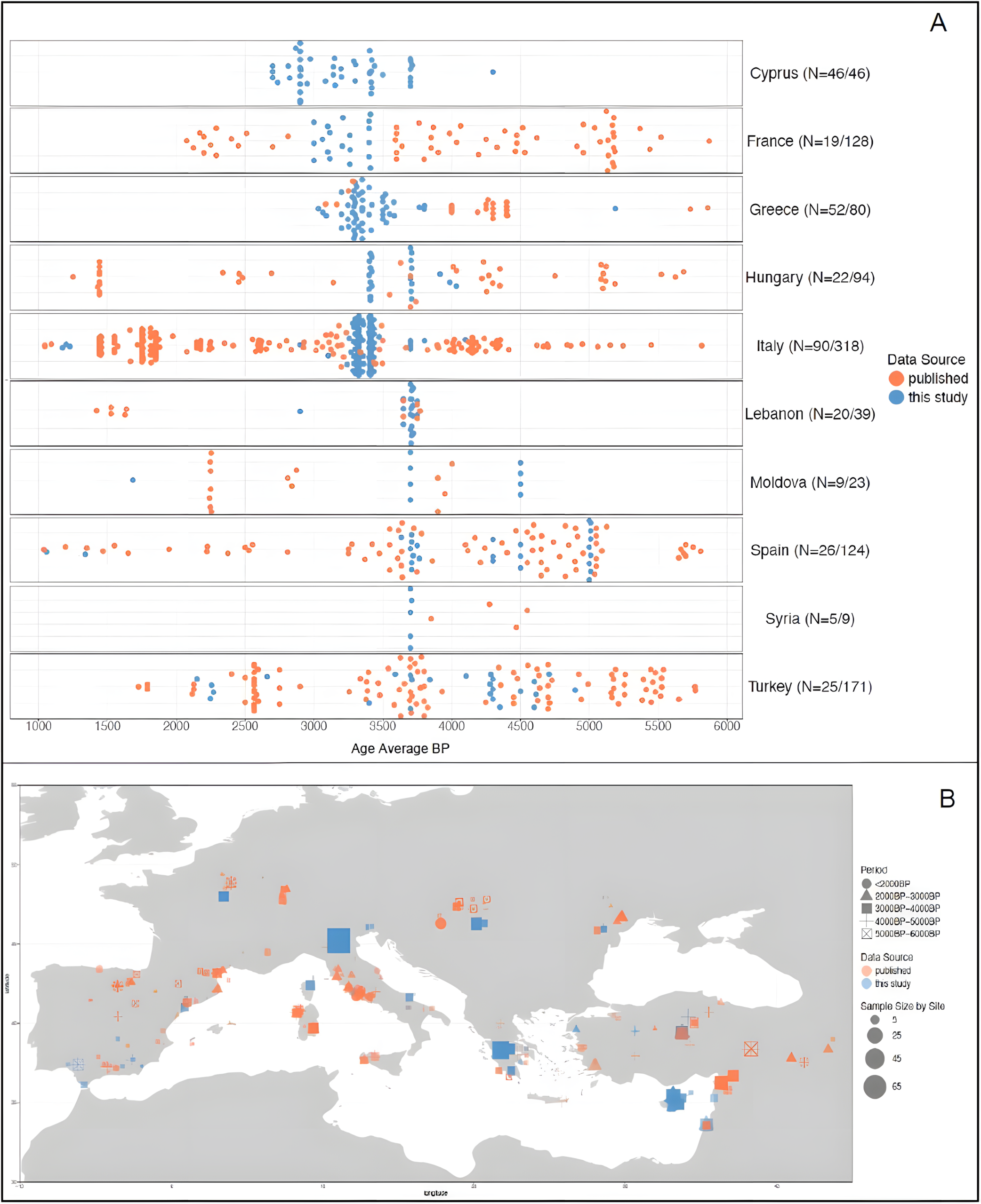 스페인, 프랑스, 이탈리아, 헝가리, 몰도바, 그리스, 키프로스, 터키, 시리아, 레바논에서 발굴된 2,100년에서 5,200년 전 고대 유전체를 시퀀싱하고, 기존에 발표된 고대 유전체와 결합하여 총 2,403개 샘플을 분석했다.