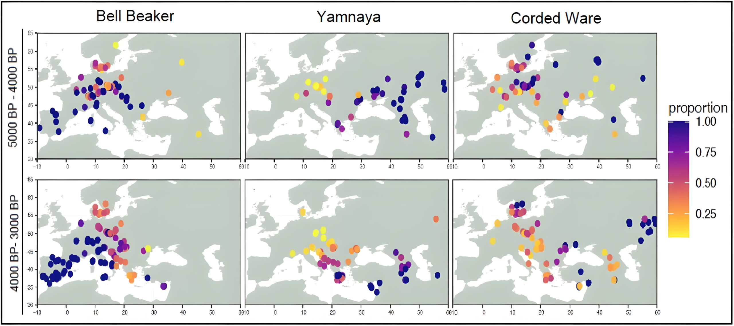 특히, 벨 비커 문화 집단은 얌나야Yamnaya 문화와 같은 초기 스텝 지역 인구의 스텝 관련 유전적 특징과 서유럽의 기존 구형 암포라 문화Globular Amphora Culture와 관련된 조상의 유전적 특징을 모두 지니고 있었다.