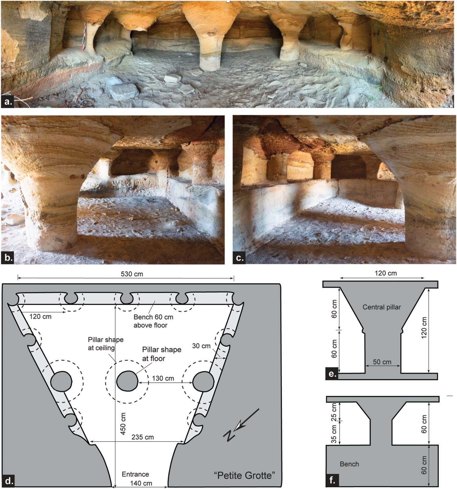 알려진 구조물 중에는 거대한 돌기둥으로 지탱되고 벽면을 따라 조각된 벤치가 있는 두 개 암굴인 그랑드 그로트Grande Grotte와 그보다 작은 프티 그로트Petit Grotte[감실龕室]가 있었다.