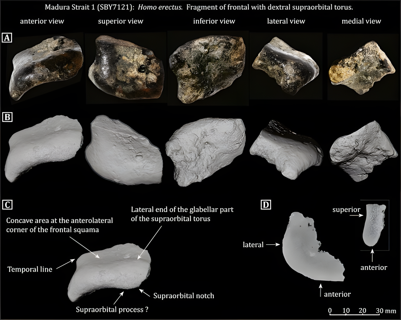 마두라 해협에서 발견된 이마뼈는 곧은 눈썹뼈와 약한 후안와 협착post-orbital constriction을 보이는데, 이는 초기의 원시적인 형태가 아닌 후기 자바 호모 에렉투스 특징이다.
