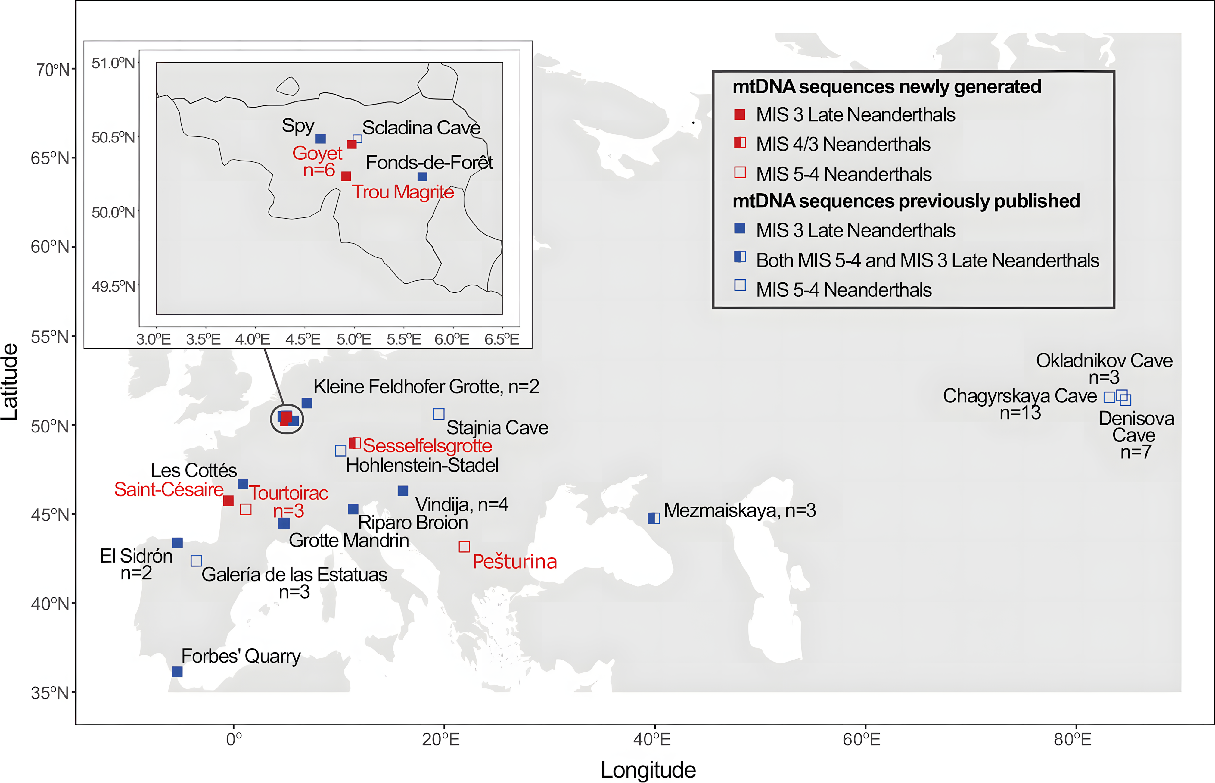 연구진은 벨기에, 프랑스, 독일, 세르비아 6개 고고학 유적에서 발굴된 네안데르탈인 화석 10개에서 미토콘드리아 DNA 염기서열을 수집했다.