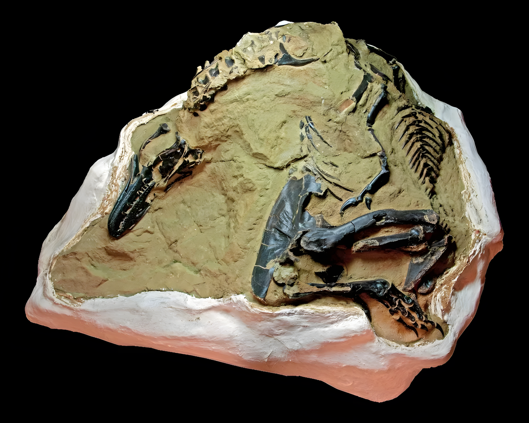 결투하는 공룡 화석 중 하나인 이 수각류theropod 화석은 화석을 감싸고 있다.