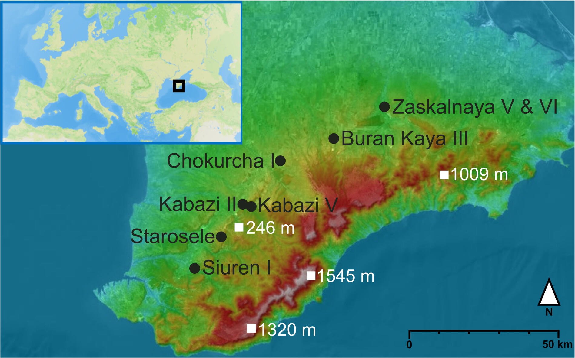 크림반도의 스타로셀레Starosele 고고학 유적[첨부사진 및 설명 보면 알겠지만 이 유적은 구석기 바위그늘이다]은 연구 결과 중기 구석기 시대 네안데르탈인의 활동 가능성이 높은 곳으로 확인되었지만, 호미닌 유골의 보존 상태가 좋지 않고 희귀성 때문에 DNA 증거가 부족했다.