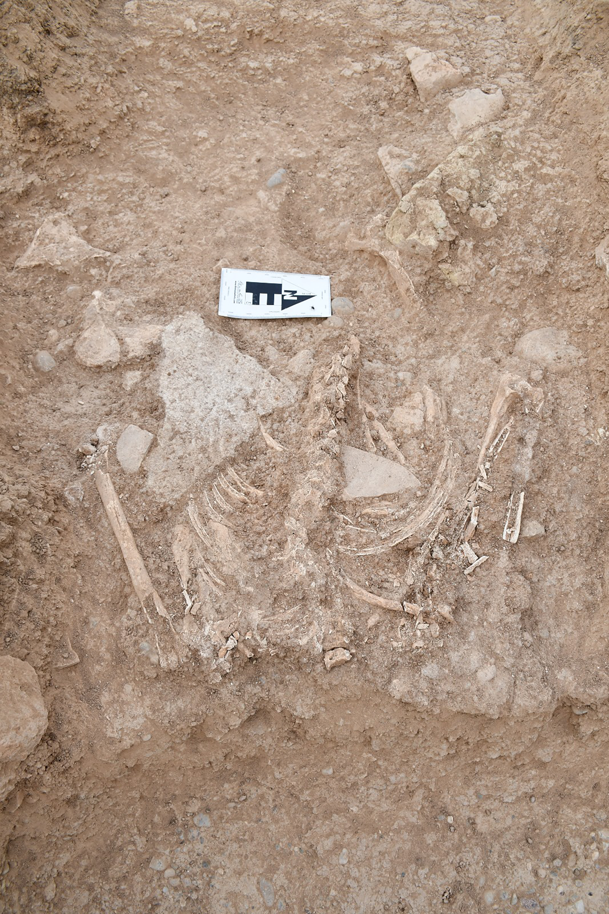 성문 바로 안쪽에서는 관절이 부분적으로 연결된 성인 유골 하나가 점토 표면에 엎드린 채 발견되었다.