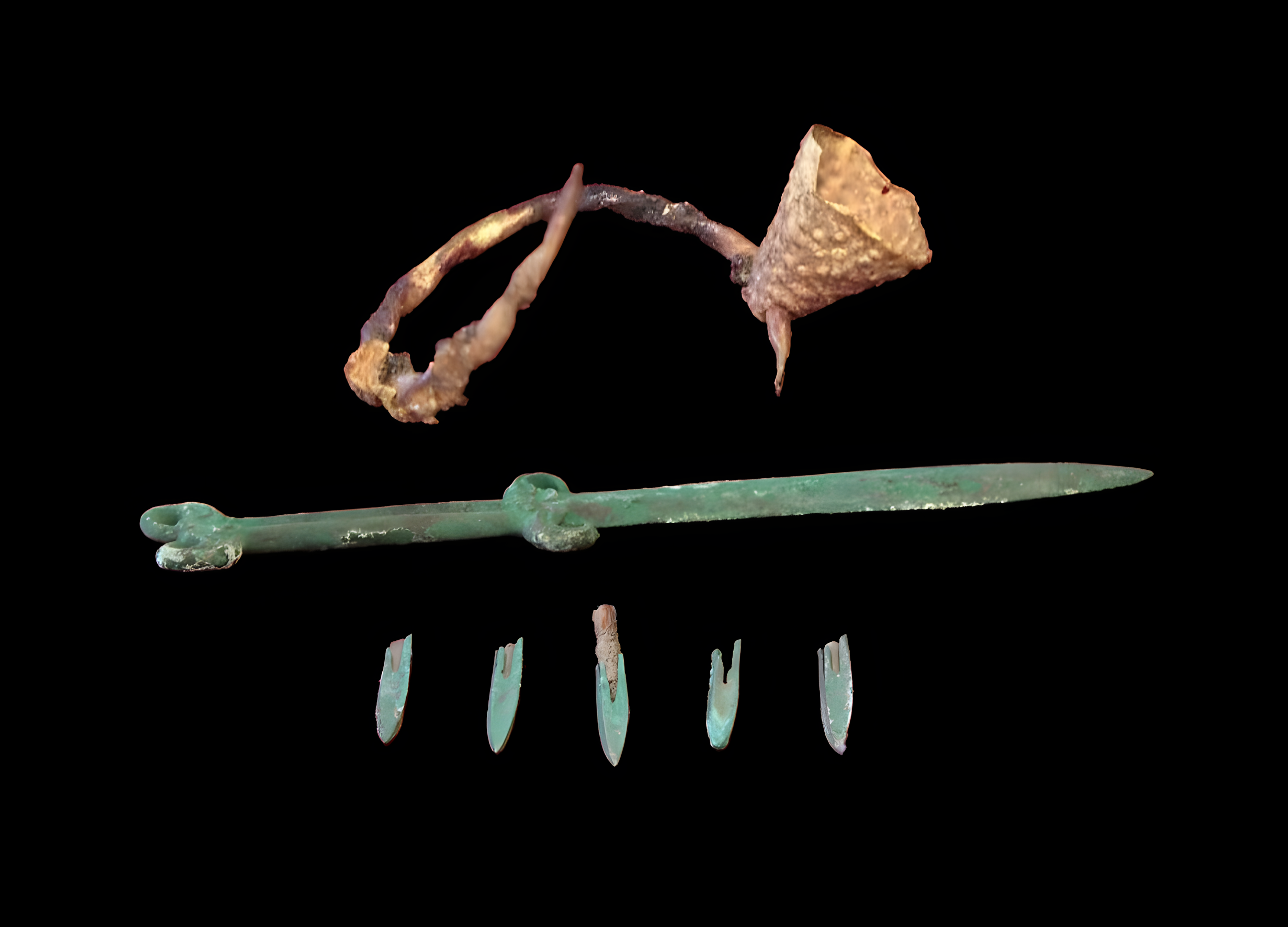 고고학자들은 그 아래에서 전사의 유해와 함께 장검 1점과 더불어 다섯 개 화살, 그리고 얇은 금박으로 감싼 철제 귀걸이를 발견했다.