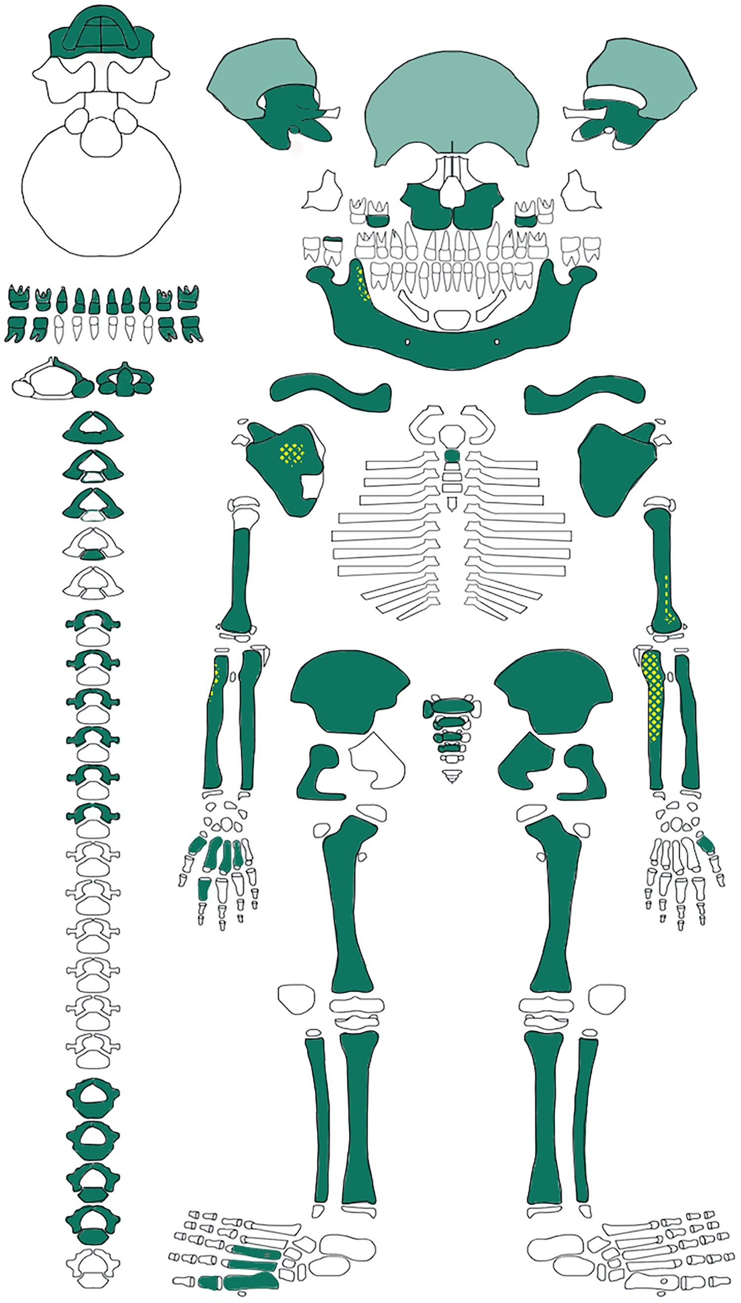 73A 유골은 비정상적인 골격 변형을 보였는데, 어린이의 턱뼈, 견갑골, 왼팔뼈의 몸통 등 다양한 뼈가 두꺼워지고 부어올랐다. 특히 왼쪽 척골left ulna(아래팔뼈)은 평소 크기 거의 두 배로 부어 있었다.
