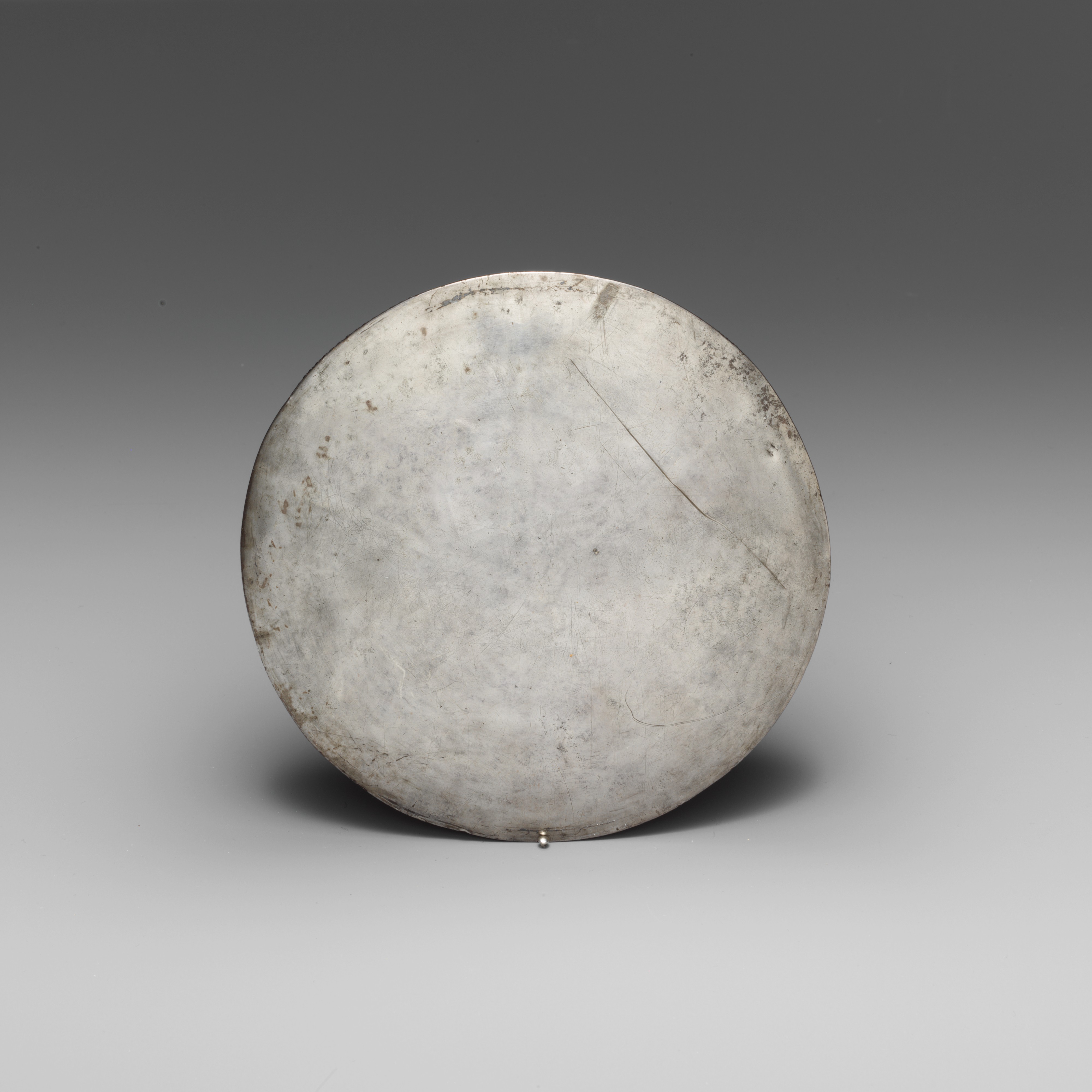 The type of mirror with a horizontal handle originated in the Roman world during the first century B.C. It was subsequently adopted in various cultures of Asia and finally died out in the ninth to tenth century A.D. In this example, the classical origins are clear in the leaf-shaped attachments of the handle, the Herakles knot, and the wreath around the circumference of the disk.