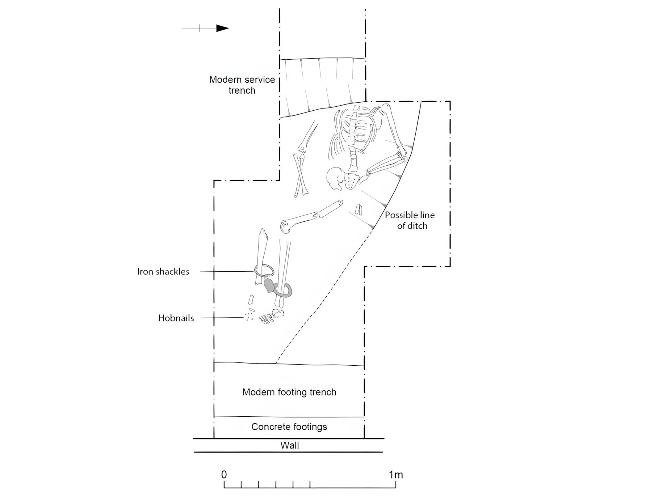 일반적으로 해방되었거나 재해로 사망한 사람들 유골과는 달리, 이 유골은 의도적인 매장, 즉 발목에 쇠사슬이 채워진 채 마지막 안식처에 묻힌 매우 드문 사례를 제공한다.