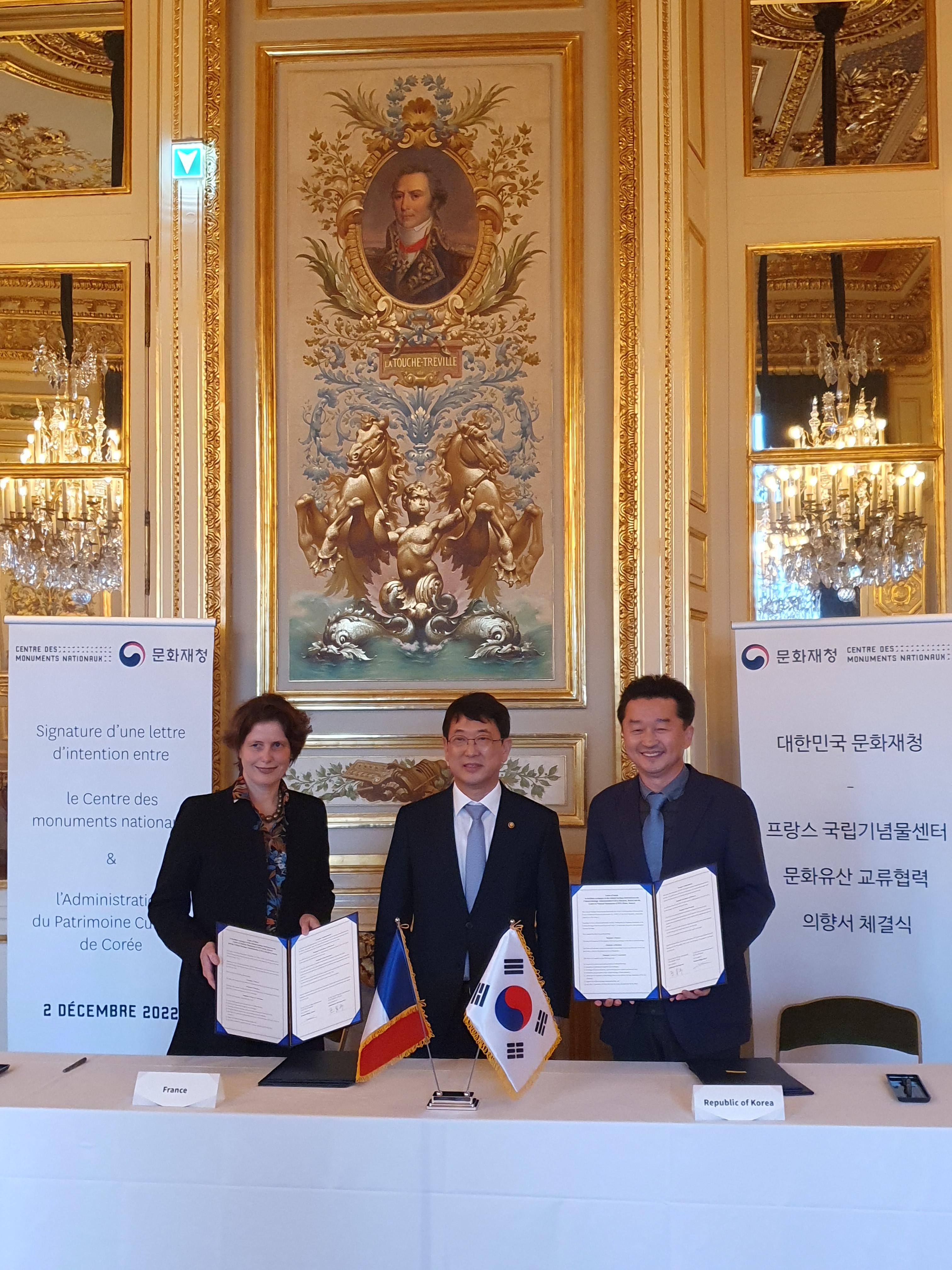 문화재청(청장 최응천)은 12월 2일 오전 10시(현지 시각) 프랑스 파리 호텔 드라마린(Hotel de la Marine)에서 프랑스 국립기념물센터(기관장 Philippe Bélaval)와 문화유산 교류협력 의향서(Letter of Intent)를 체결한다.