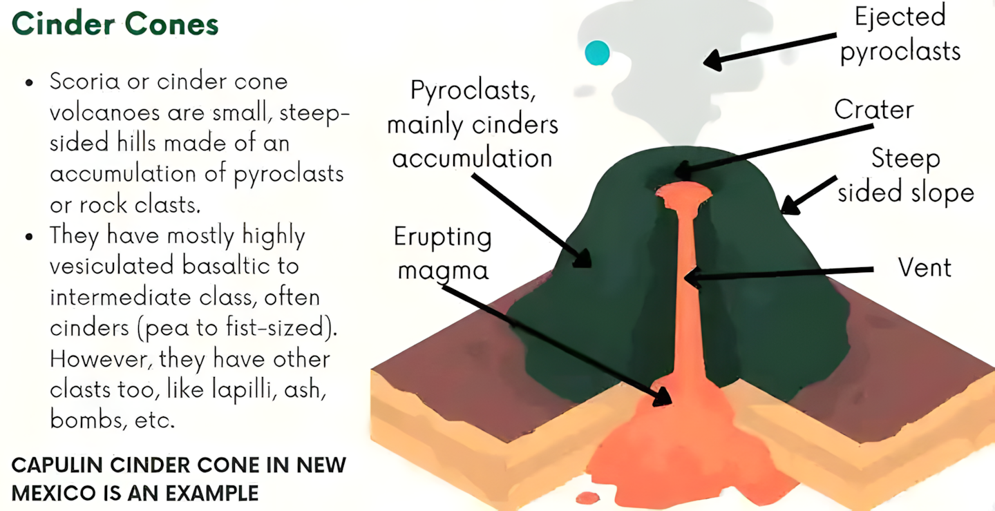 모양: 원뿔 모양 또는 언덕 모양이며, 분출구에서 바깥쪽으로 경사가 가파른 측면을 지닌다.