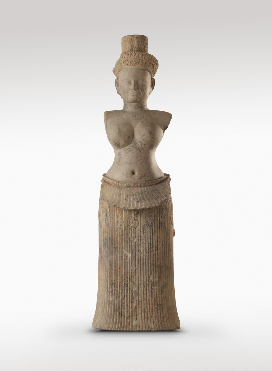 머리 장식과 허리띠에 새긴 정교한 꽃무늬는 언덕 위 사원인 프놈 바켕Phnom Bakheng 조각을 연상시키며, 프놈 바켕 부조와의 시각적 유사성은 이 조각상이 해당 사원과 밀접한 관련이 있음을 더욱 분명히 보여준다.