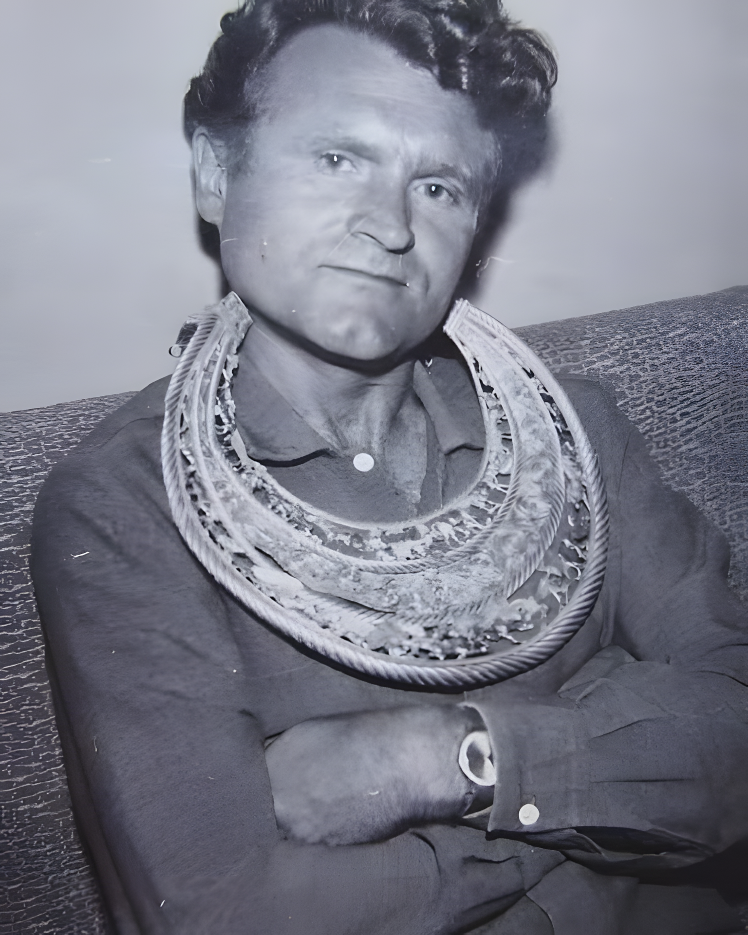 우크라이나 고고학자 보리스 모졸렙스키Borys Mozolevsky가 1971년 자신이 발굴한 기원전 4세기 스키타이 순금 목걸이가슴장식Scythian Golden Pectoral을 착용해 보았다.