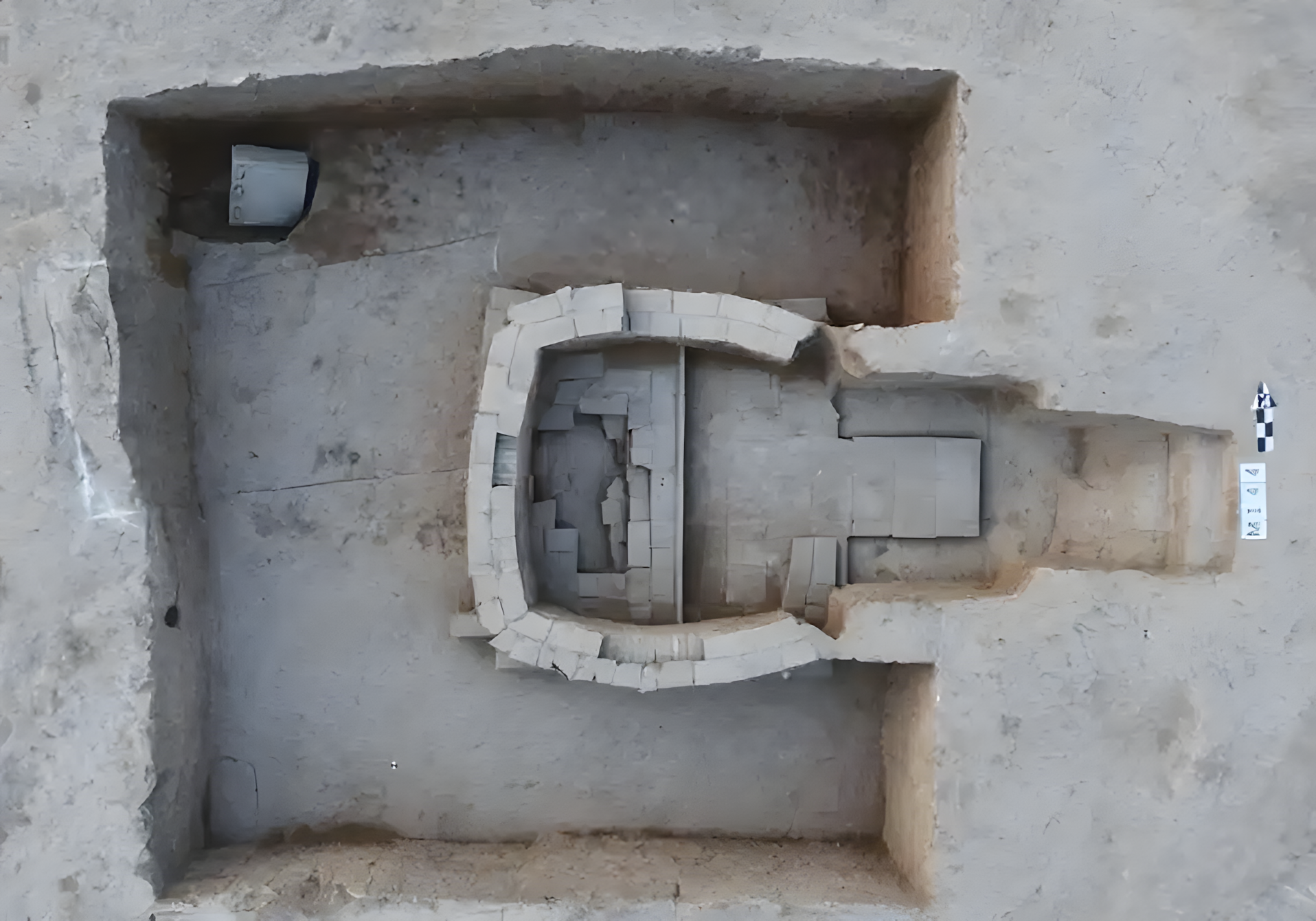 묘실 주변에서는 길이 5.40m, 너비 5.80m, 깊이 1.00m 다짐토 기초가 발견되었으며, 다짐토가 선명하게 보인다.