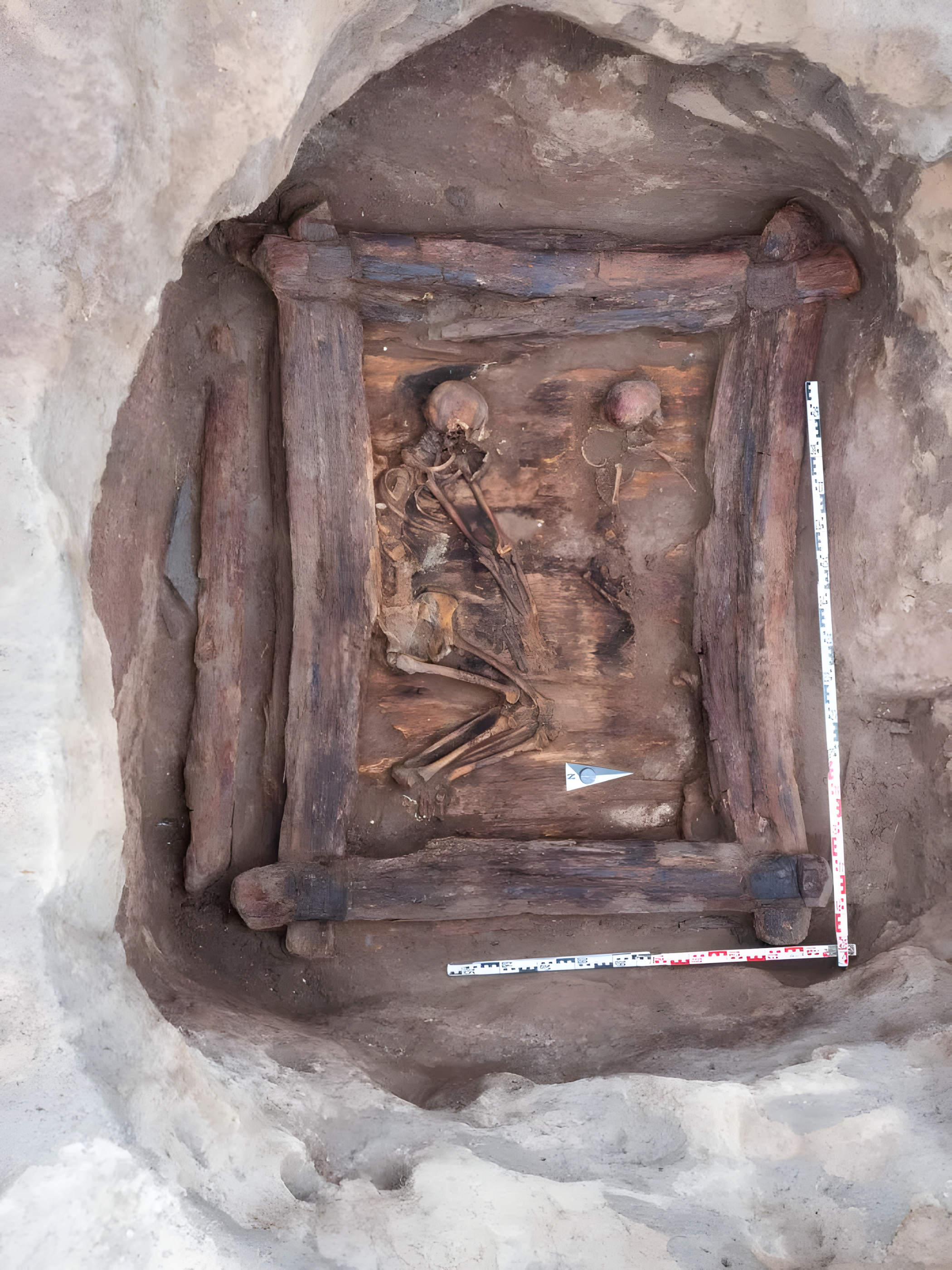 첫 번째 봉분에는 견고한 나무 기둥 골조 위에 세운 목조 매장실이 있었고, 그 안에서 50세 여성과 어린아이 유골이 발견되었다.