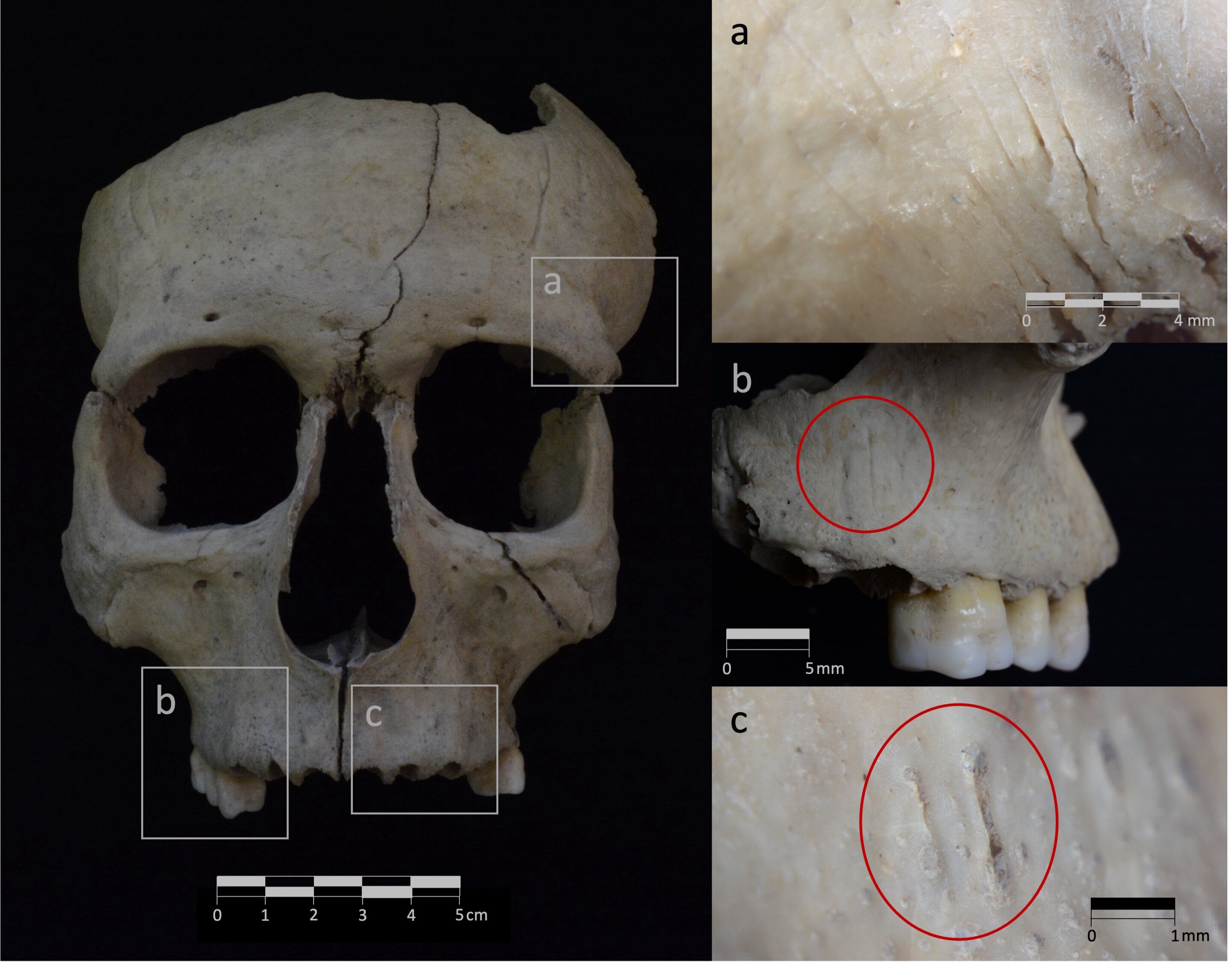 "이러한 흔적은 두개골에서 살점을 제거하는 과정에서 남은 것으로, 두피뿐만 아니라 얼굴 피부까지 제거되었음을 시사한다. 흔한 관습은 아니지만, 프랑스와 영국을 포함한 유럽 유적의 의식에서 이러한 흔적이 발견되었다"고 율랄리아 수비라는 설명한다.