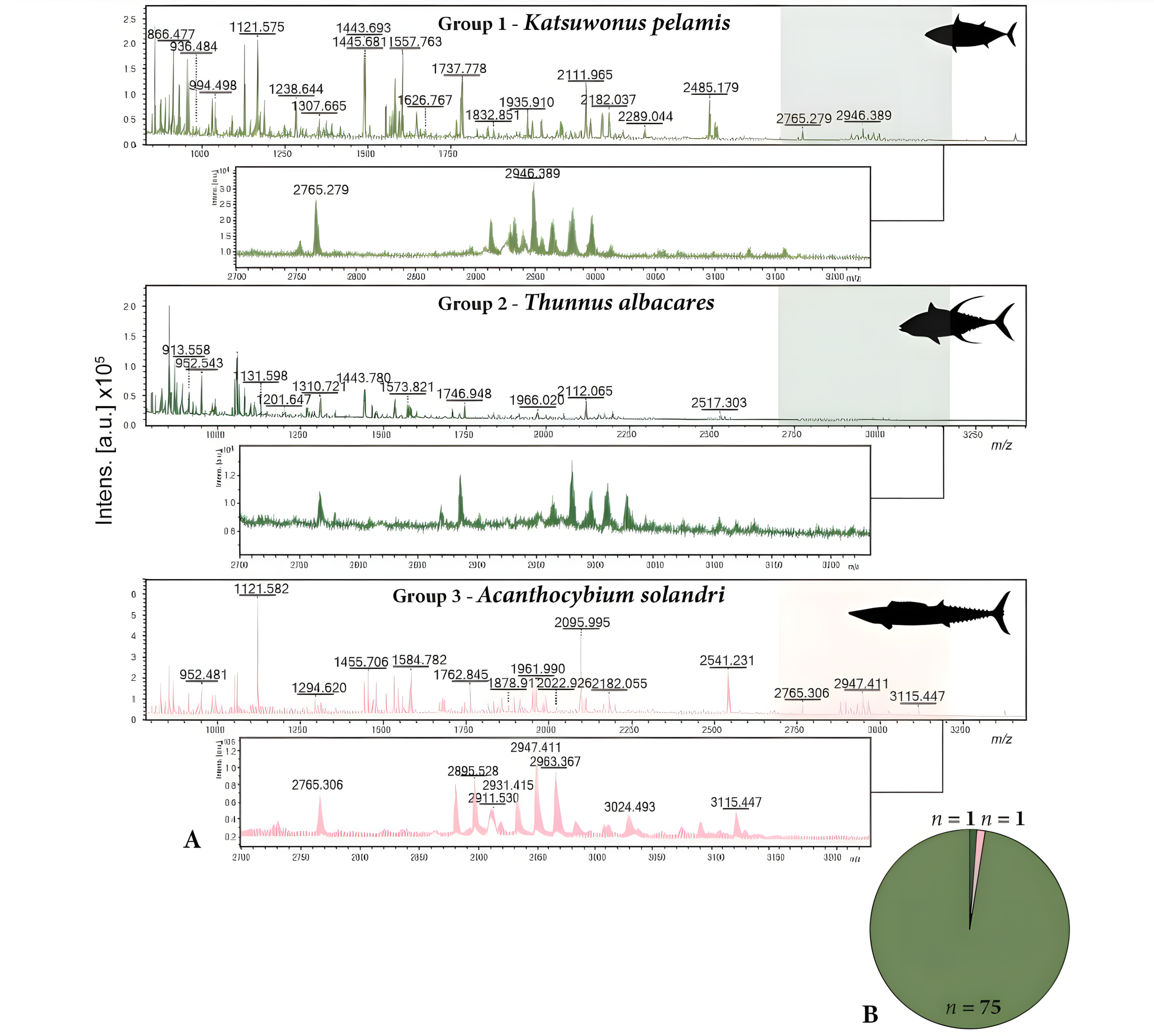 이 방법은 높은 신뢰도로 참치류 뼈 97%를 식별했다. 77개 참치류 시료 중 75개는 가다랑어skipjack tuna였고, 나머지 2개는 황다랑어yellowfin tuna와 와후wahoo였다.