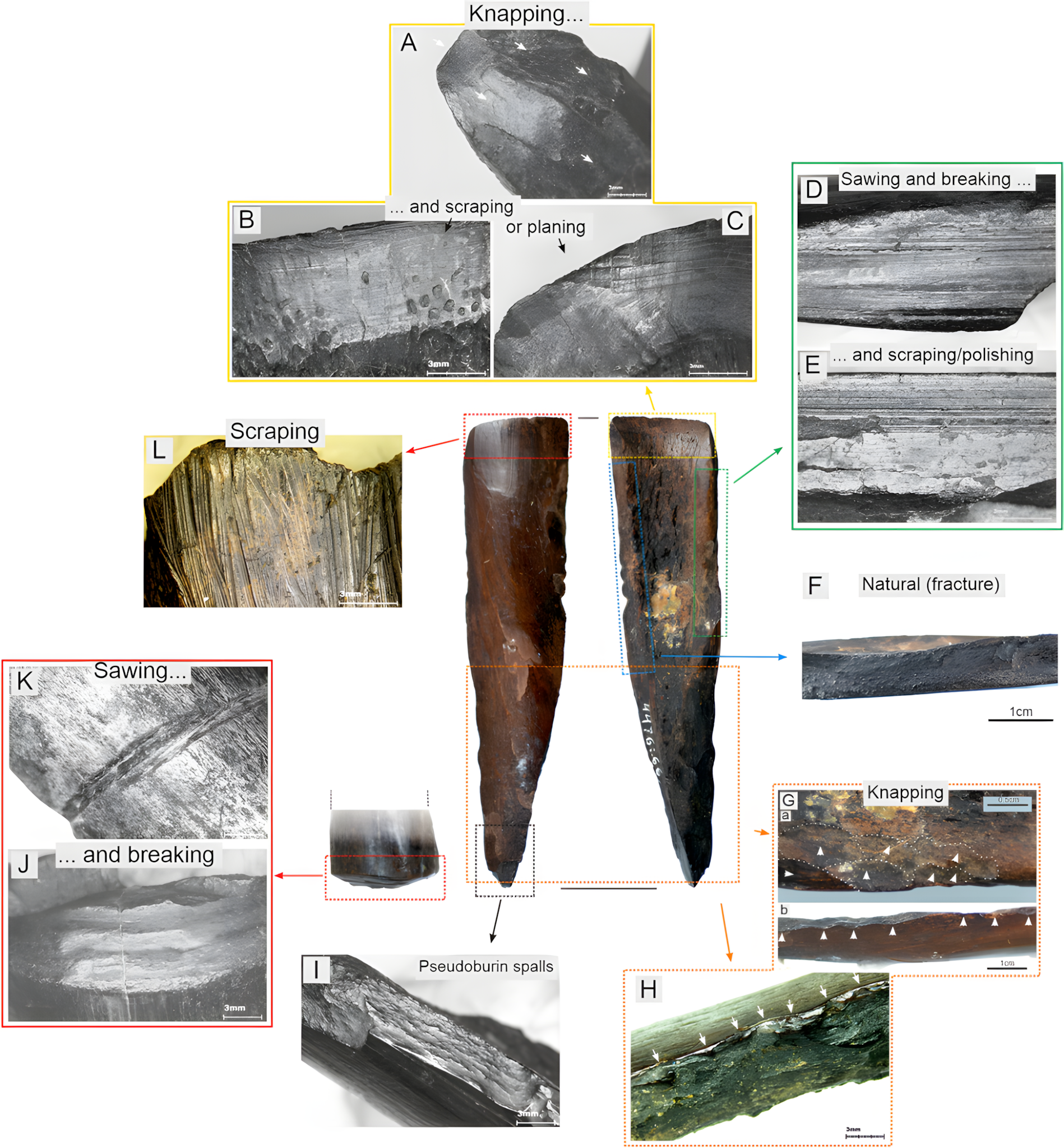 연구진은 석기 시대에 사용한 것과 유사한 플린트 도구를 사용해 모서리가 비스듬하게 깎인 뼈 도구의 새로운 버전을 만들고 고기, 가죽, 생목재와 건목재, 소나무, 오리나무, 자작나무를 포함한 나무껍질 등 다양한 재료에 사용해 보았다.