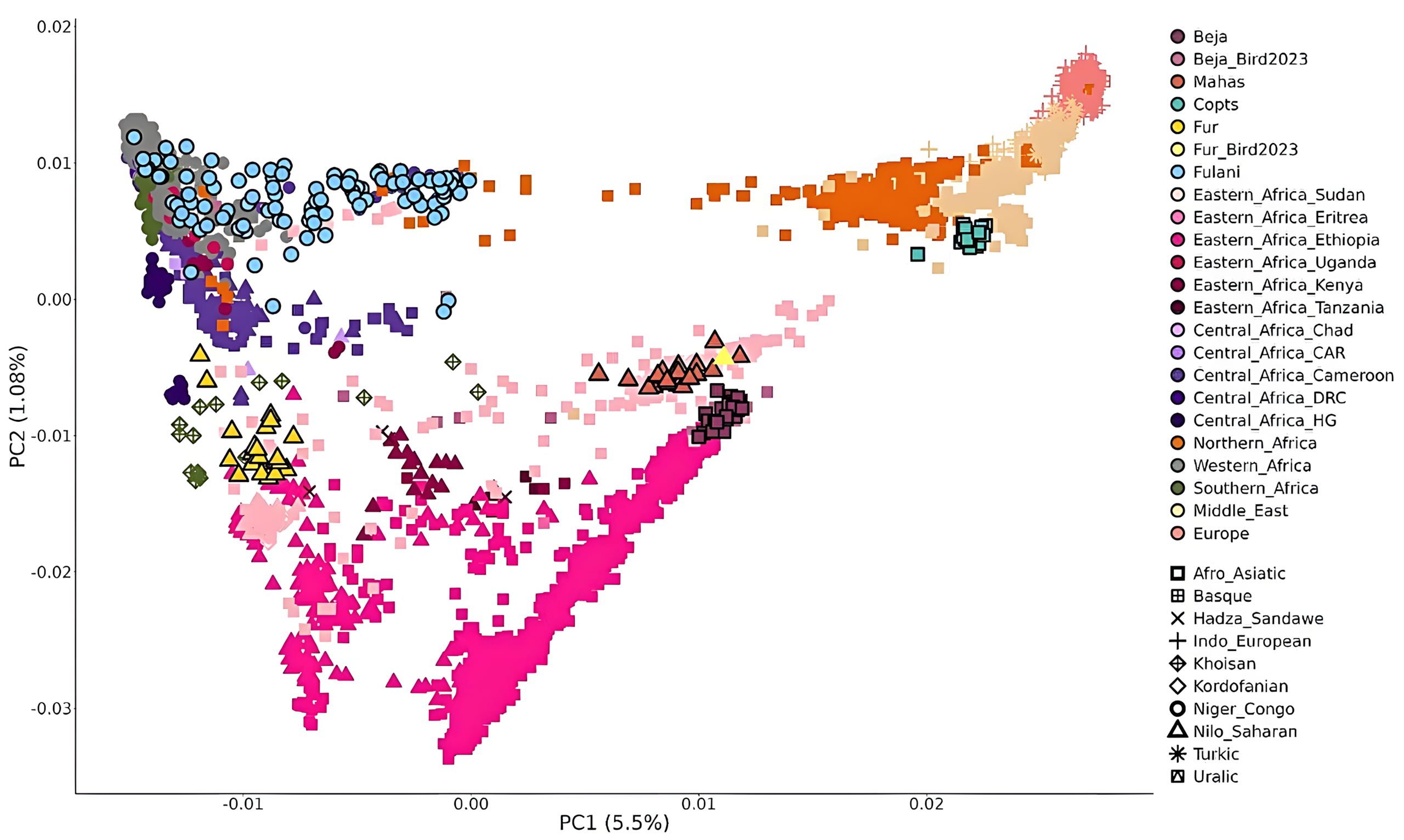 이 연구는 수단의 다섯 민족 언어 집단, 즉 나일사하라어Nilo-Saharan 족 계통 언어를 사용하는 푸르족Fur과 마하족Mahas, 사막 동부에 거주하며 이집트에서 유래한 콥트어와 같은 아프리카아시아어족 계통 언어를 사용하는 유목민 베자족Beja, 그리고 사헬Sahel 지역에 거주하며 니제르콩고어Niger-Congolese족 계통 언어를 사용하는 유목민 풀라족Sahel 의 혈액 샘플 125개에서 추출한 유전체를 분석했다.