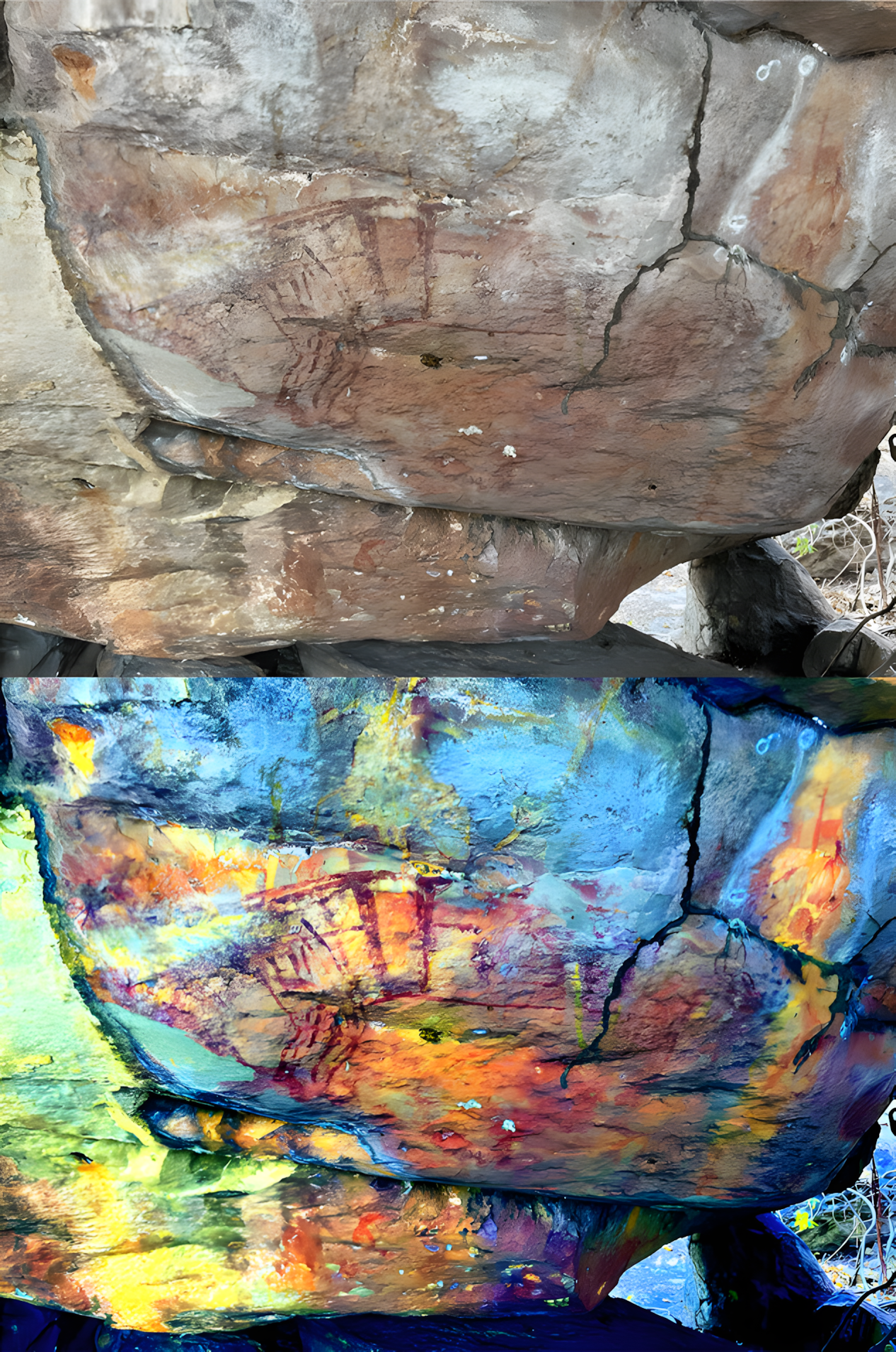 발견된 그림들은 다양한 원주민 미술 양식으로, 약 15,000년 전부터 사용한 붉은색, 때로는 노란색 황토ochre를 사용해 그렸다.