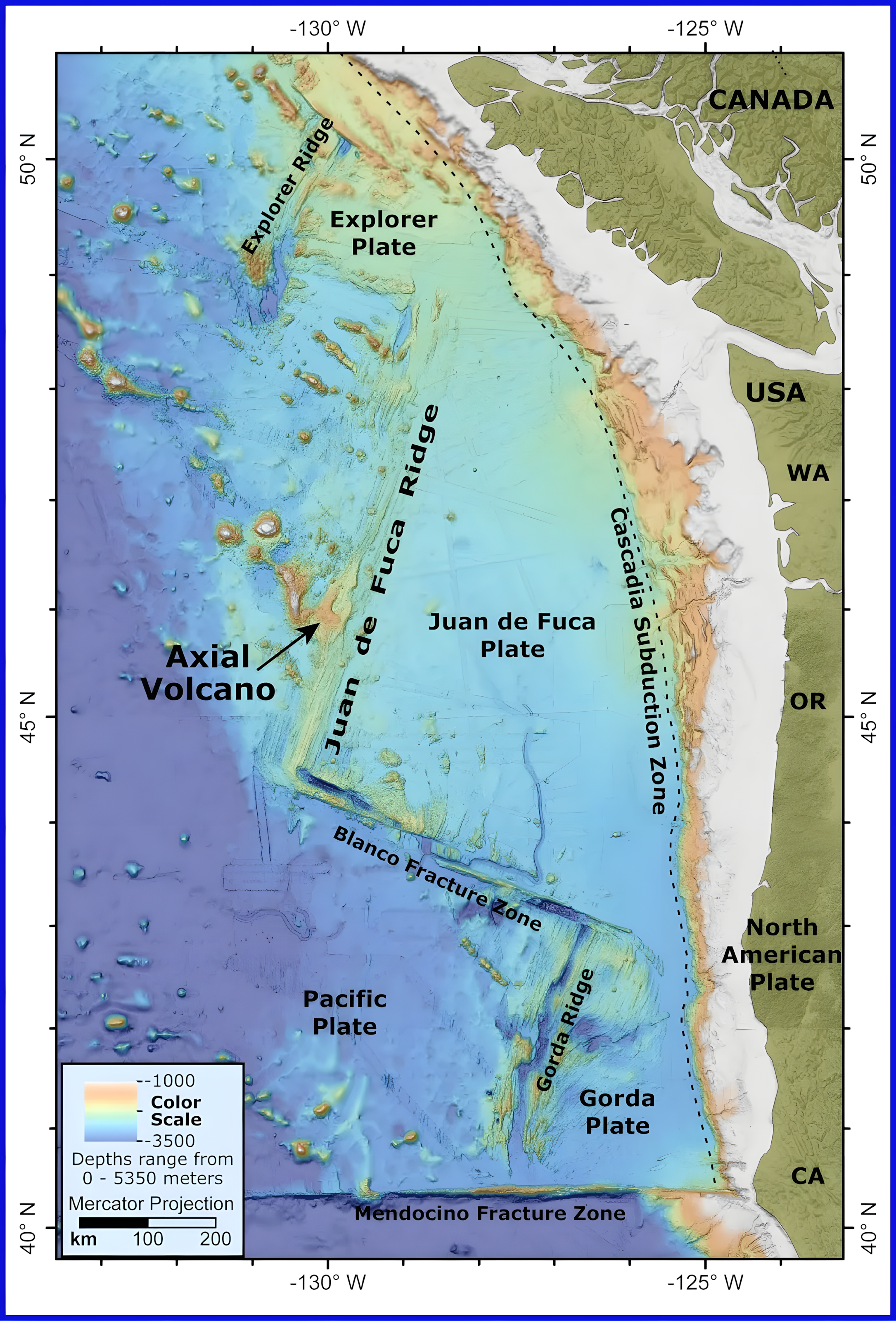 축해산은 미국 태평양 북서부 해안의 발산판 경계divergent plate boundary인 후안 데 푸카 해령Juan de Fuca Ridge에 위치한다.