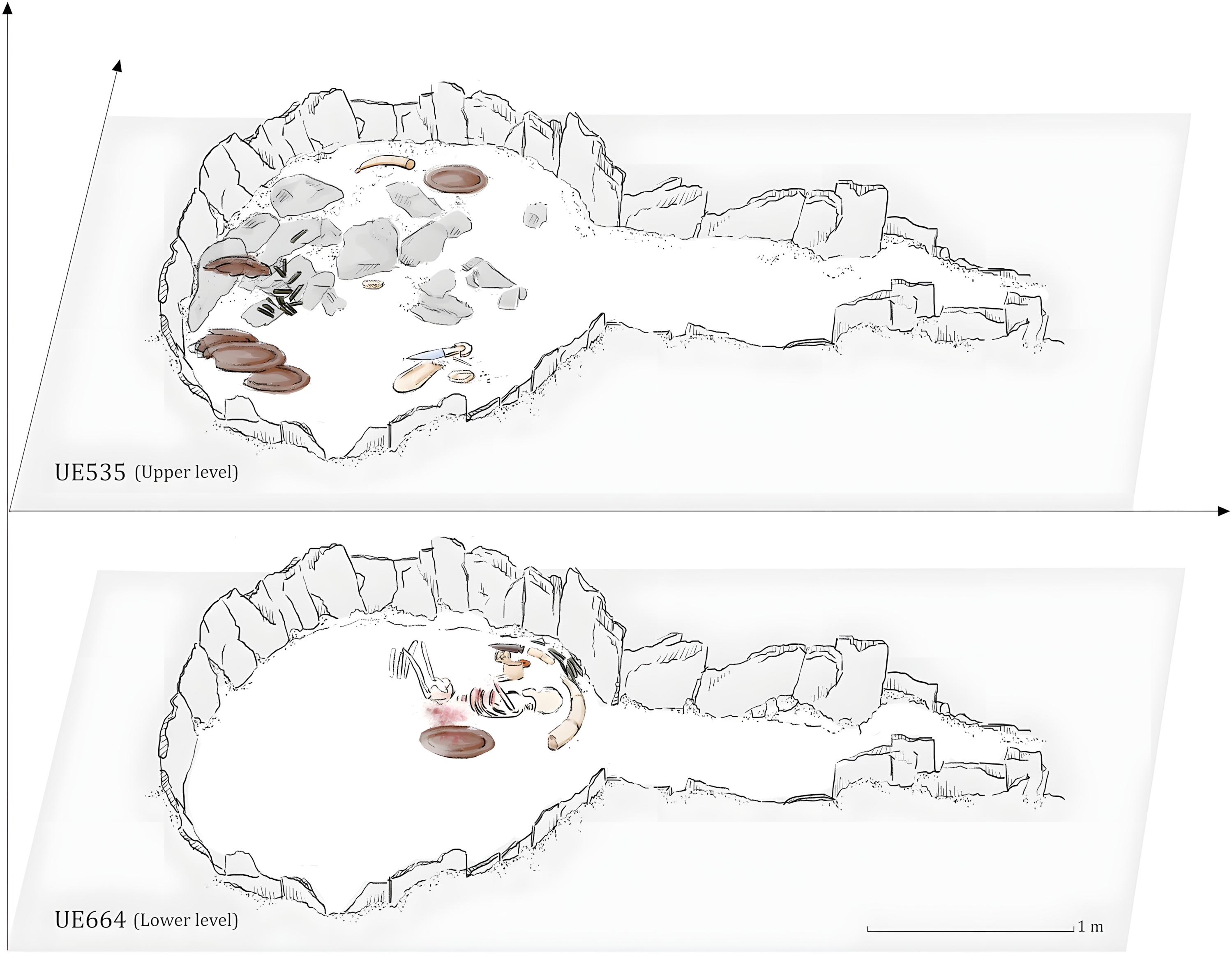 몬텔리리오의 작은 방에서 발견된 유해는 로마 시대에 심하게 훼손되었지만, 큰 방에서는 양질의 인류학적 및 유물학적 자료가 제공되었다.