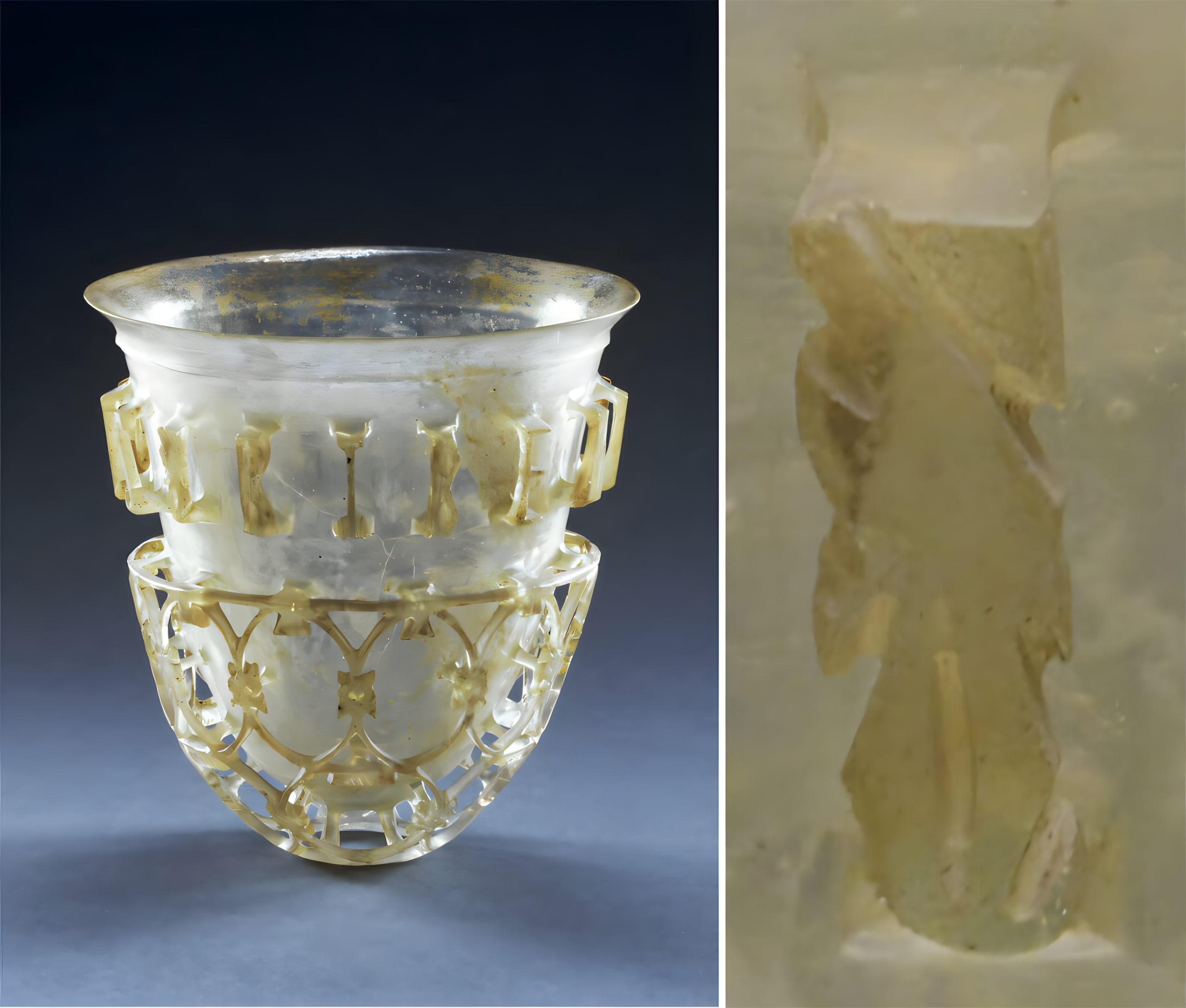 디아트레툼diatretum으로 알려진 각각의 컵은 두꺼운 벽으로 이루어진 빈 공간으로 시작되었으며, 섬세한 유리 다리로 연결된 두 개 동심원 층으로 정성껏 조각되었다.