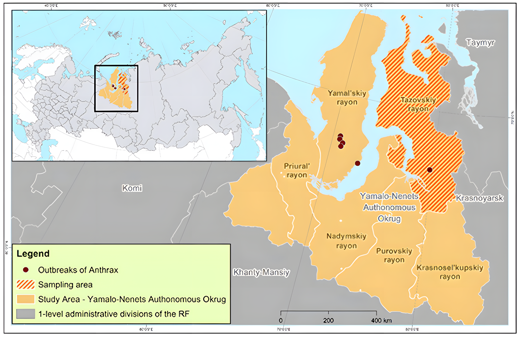 The Yamal Peninsula in the Russian Federation experienced a massive outbreak of anthrax in reindeer (Rangifer tarandus) in July–August 2016, with 2,650 (6.46% of the total susceptible population) animals infected, of which 2,350 died (case fatality rate of 88.67%).