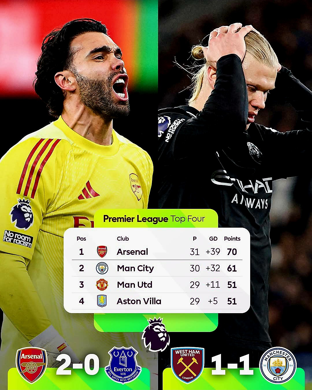 오늘 현재 승점은 아스널 70, 맨시티 61이라 맨시티가 덜 치른 한 경기를 승리한다 해도 승점 6이 되어 두 경기 차이가 난다.