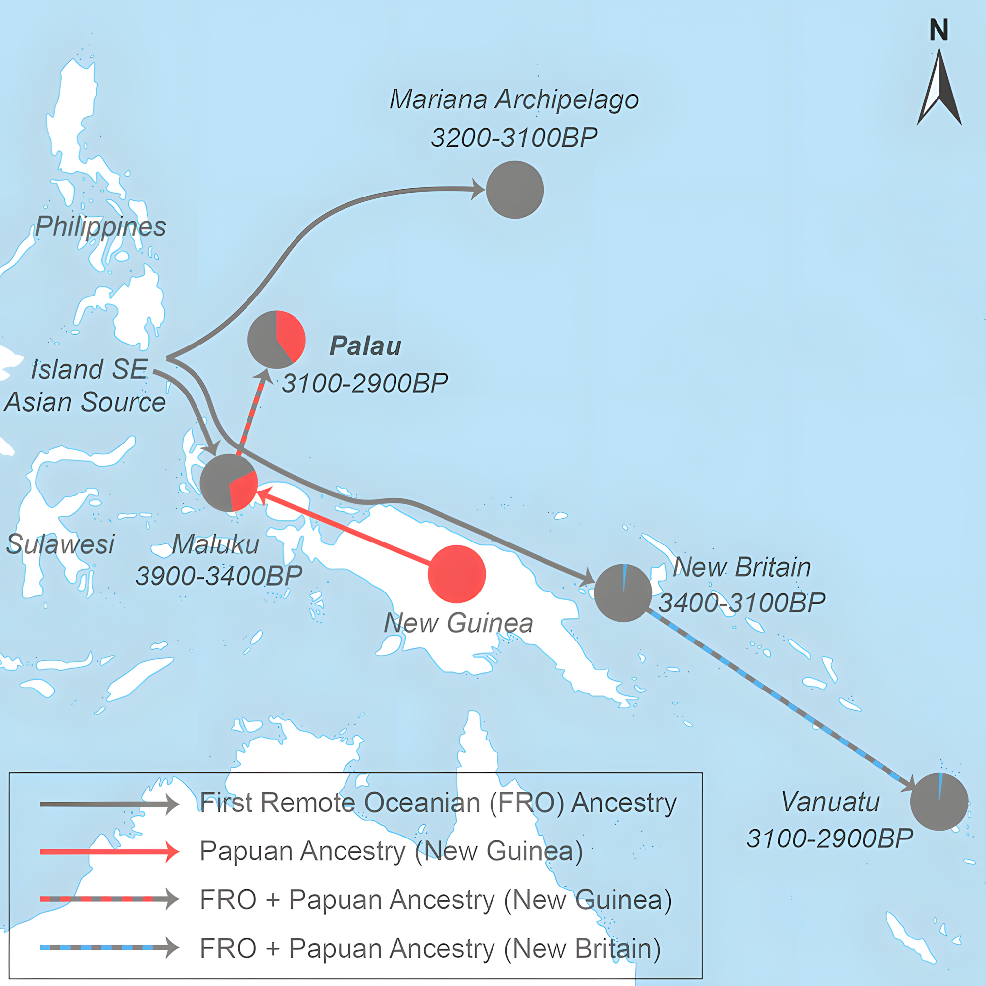 이 설명에 따르면, 거의 전적으로 동아시아계 조상을 지닌 이 여행자들은 훨씬 후인 약 2,500년 전에야 현지 파푸아인 집단(수만 년 동안 태평양에 거주해 온 뉴기니와 인근 섬의 토착민)과 혼혈되었다고 한다.